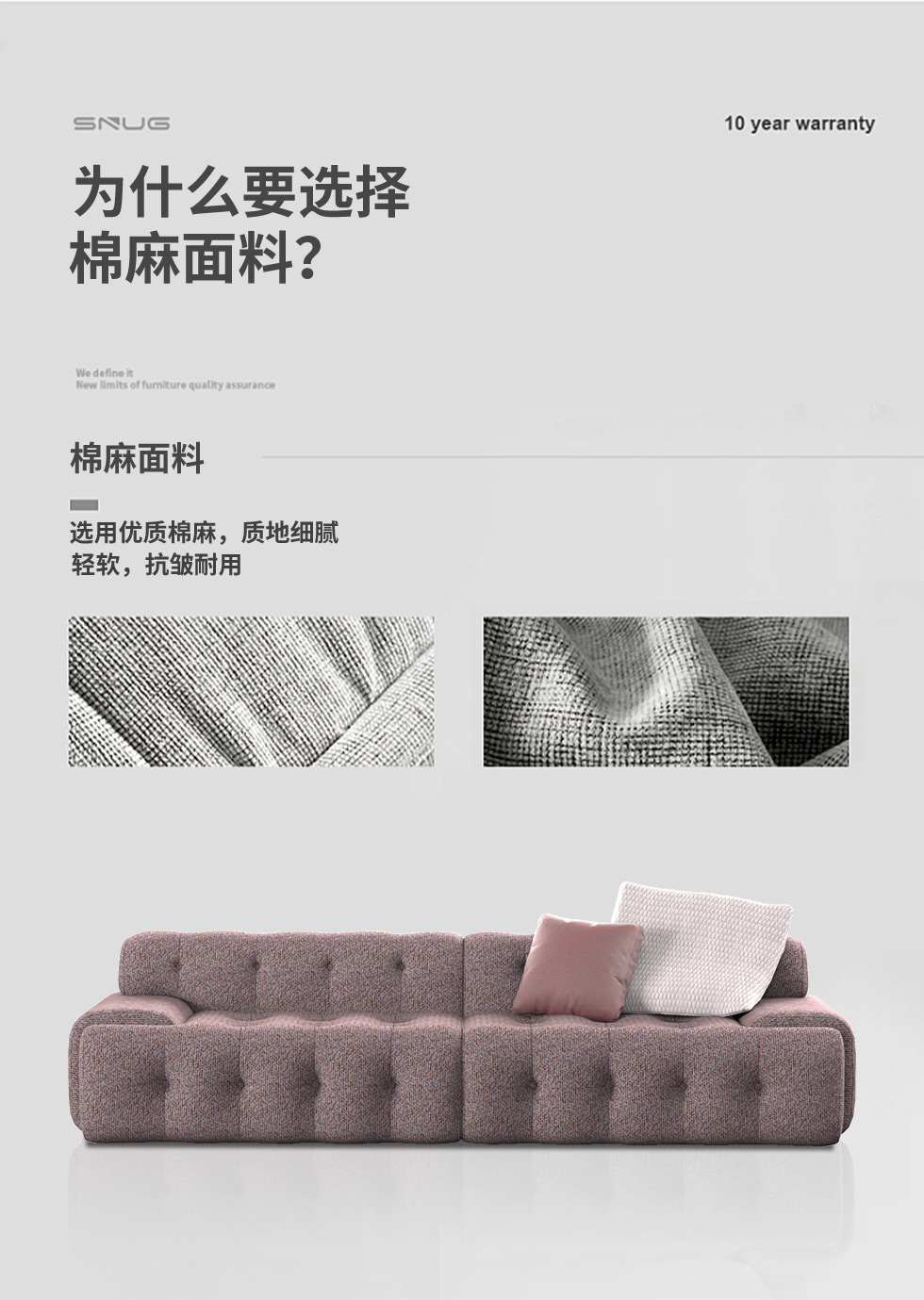 缔造 极简 优质棉麻布+羽绒+高密度海棉+碳素钢脚+北美白蜡木(做碳灰木色)边框+铁片包马铵硬皮 布艺沙发 四人位2.44米沙发