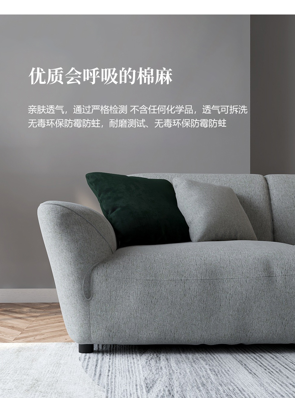 缔造 极简 优质棉麻布+羽绒+高密度海棉+碳素钢脚+北美白蜡木(做碳灰木色)边框+铁片包马铵硬皮 布艺沙发 四人位2.44米沙发¥20012