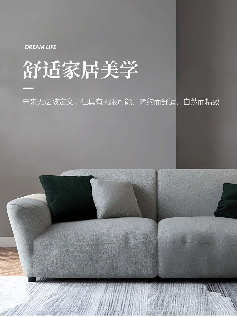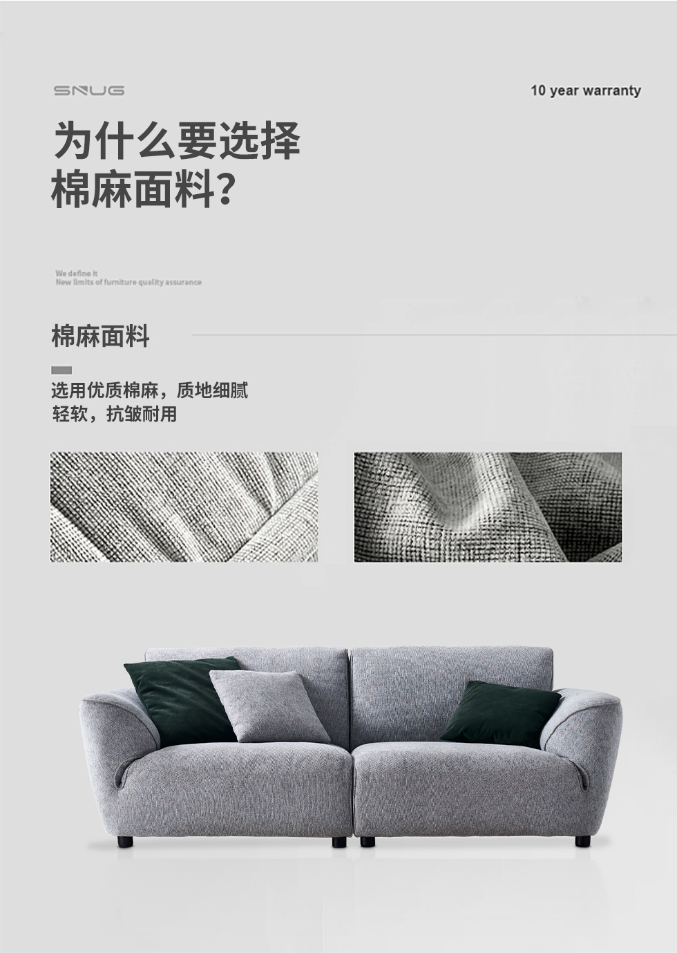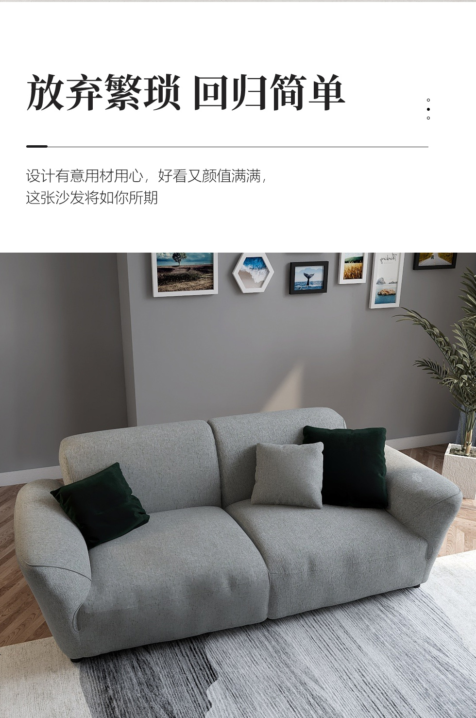 缔造 极简 优质棉麻布+羽绒+高密度海棉+碳素钢脚+北美白蜡木(做碳灰木色)边框+铁片包马铵硬皮 布艺沙发 四人位2.44米沙发