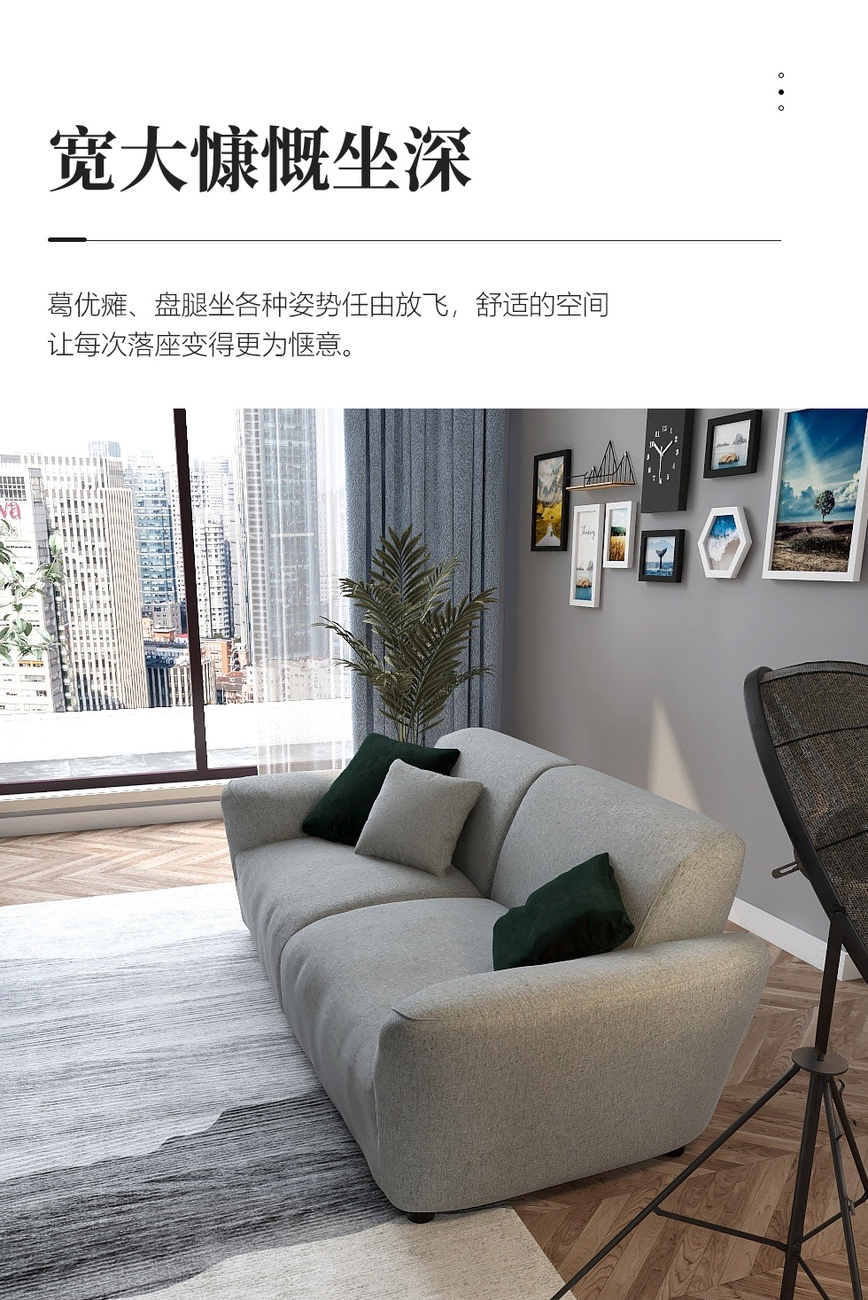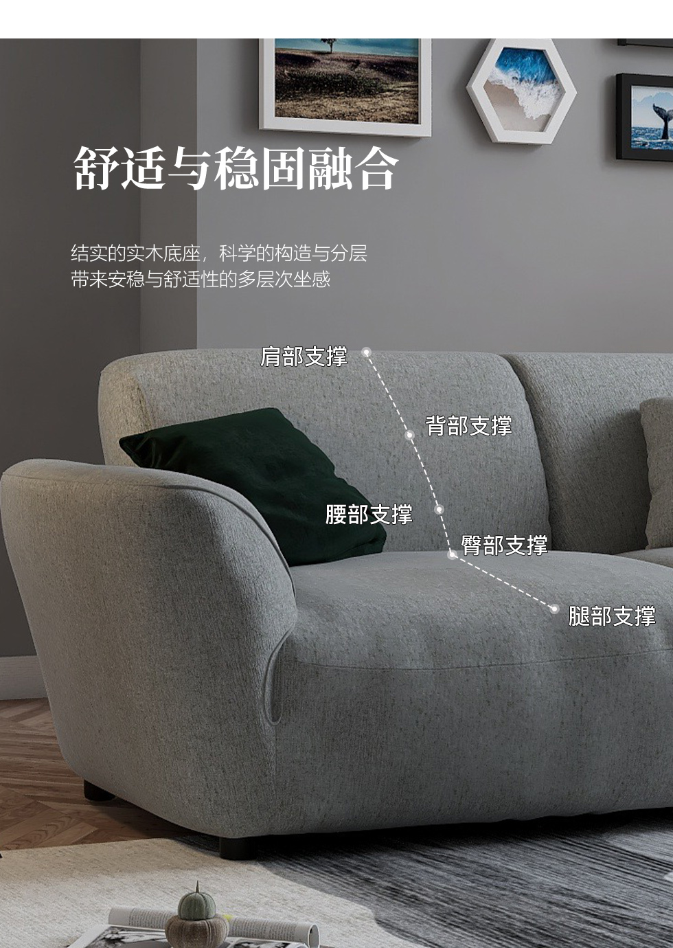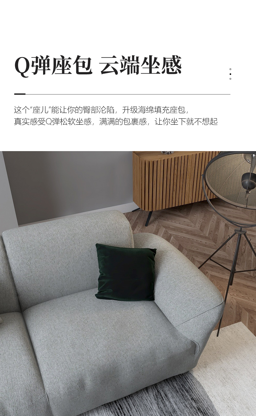 缔造 极简 优质棉麻布+羽绒+高密度海棉+碳素钢脚+北美白蜡木(做碳灰木色)边框+铁片包马铵硬皮 布艺沙发 四人位2.44米沙发