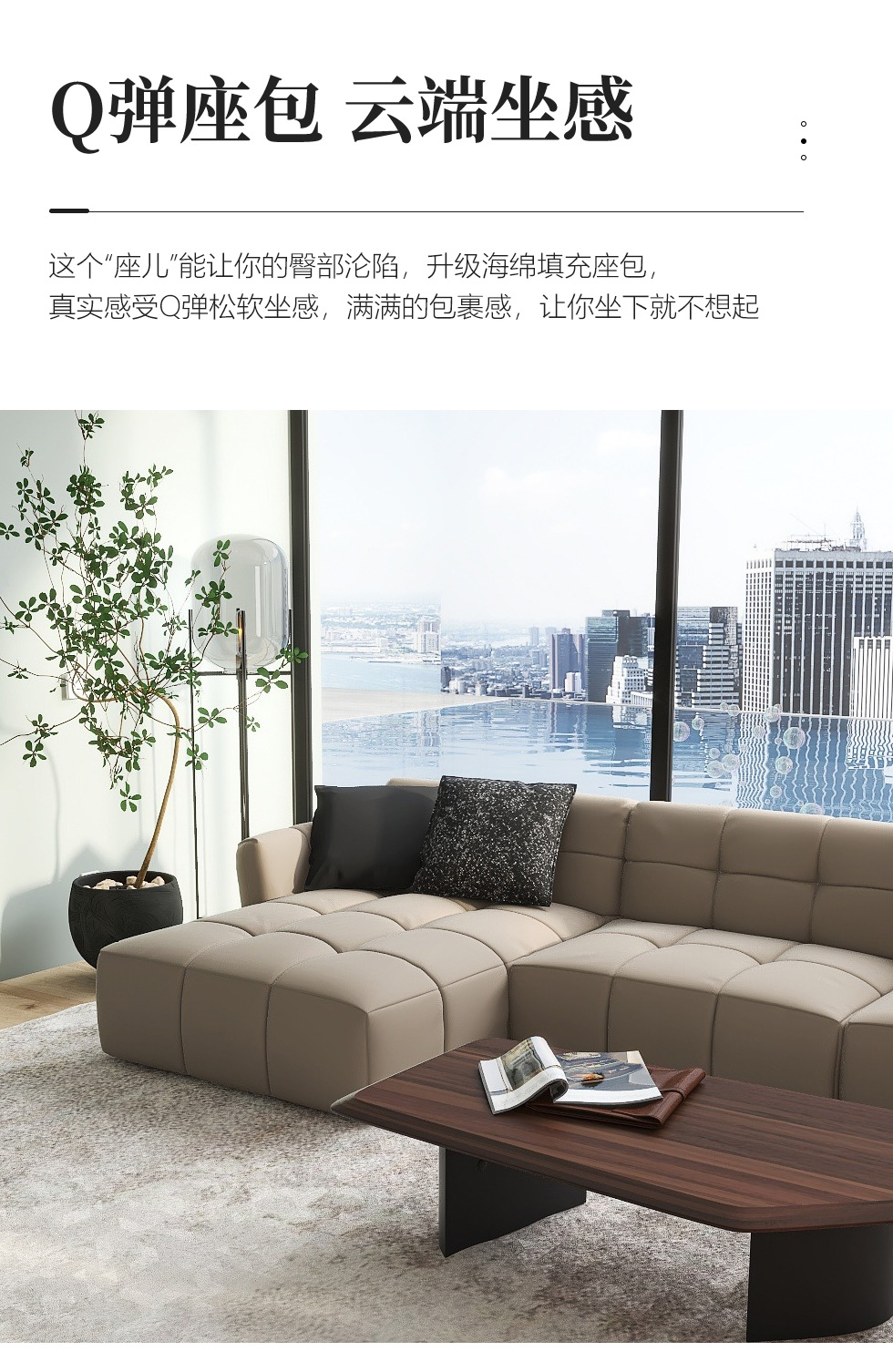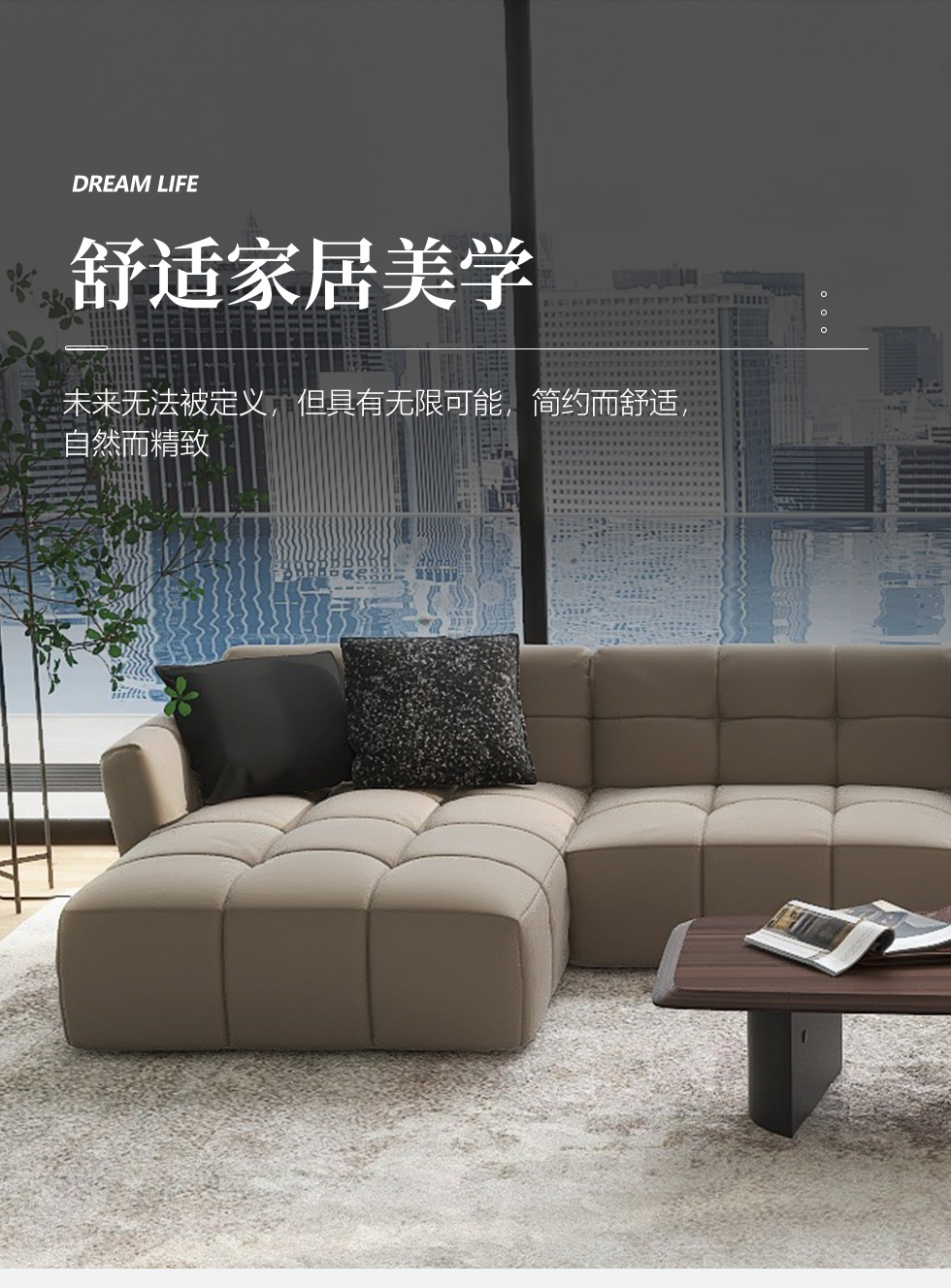 缔造 极简 接触面进口意大利头层真皮+羽绒+高密度海棉+碳素钢脚+北美白蜡木(做碳灰木色)边框+钢板包马铵硬皮 真皮转角3.19米沙发 (左3+右贵)