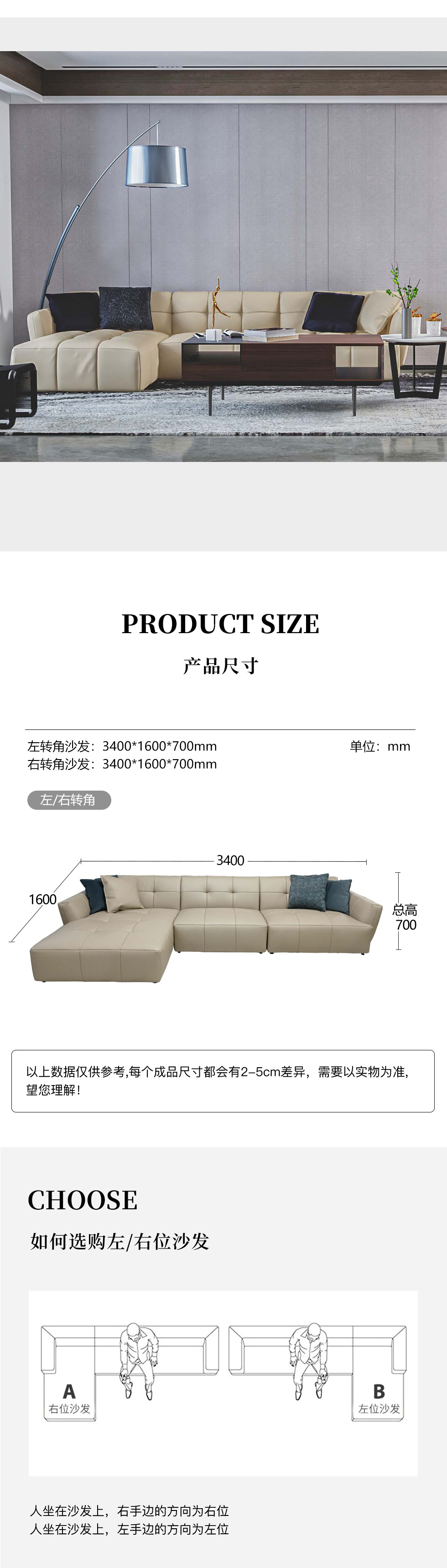 缔造 极简 接触面进口意大利头层真皮+羽丝棉+高密度海棉+碳素钢脚+北美白蜡木(做碳灰木色)真皮转角3.4米沙发 (扶手边 左1+无1+右贵)