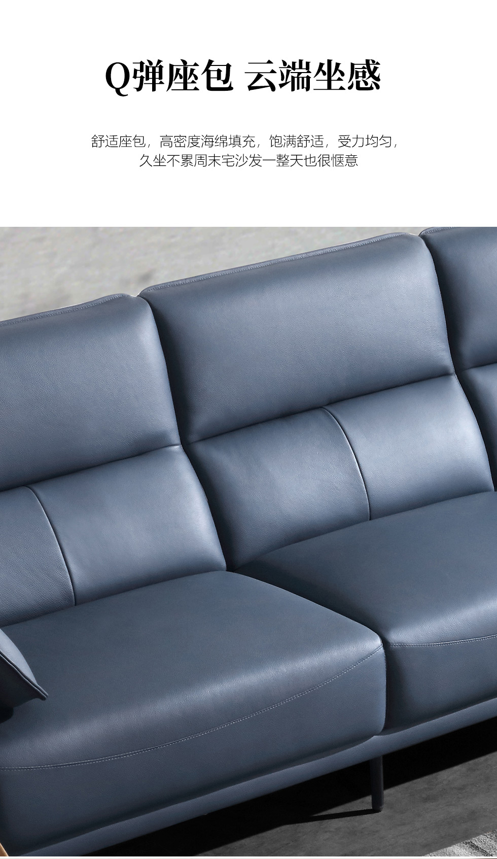 德卡图 现代简约 接触面进口头层牛皮+高密度海绵+俄罗斯进口落叶松框架 1+3+左贵妃位 浅蓝色 皮艺转角3.25米沙发