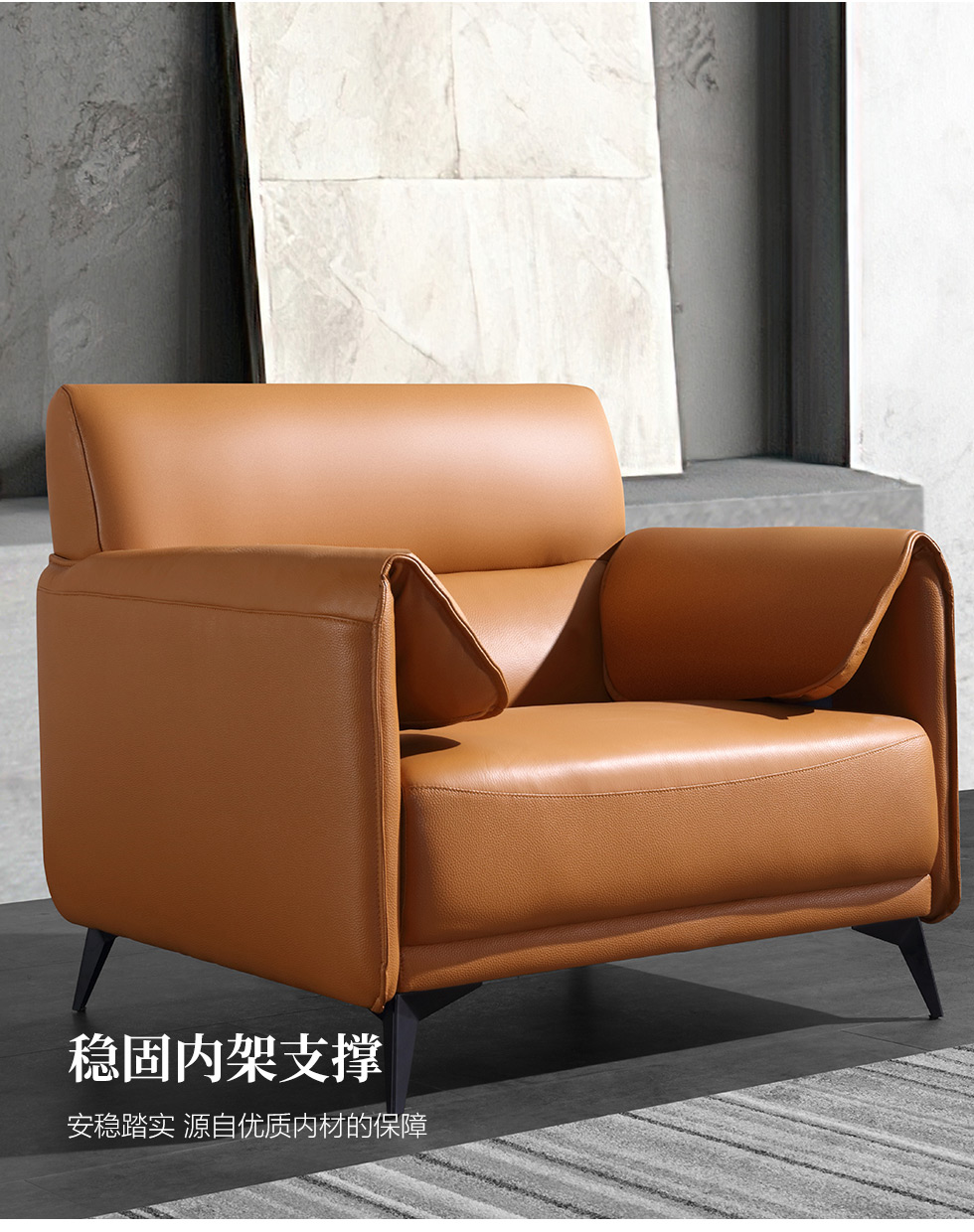 德卡图 现代简约 接触面进口头层牛皮+高密度海绵+俄罗斯进口落叶松框架 单人位 橙色 皮艺0.95米沙发