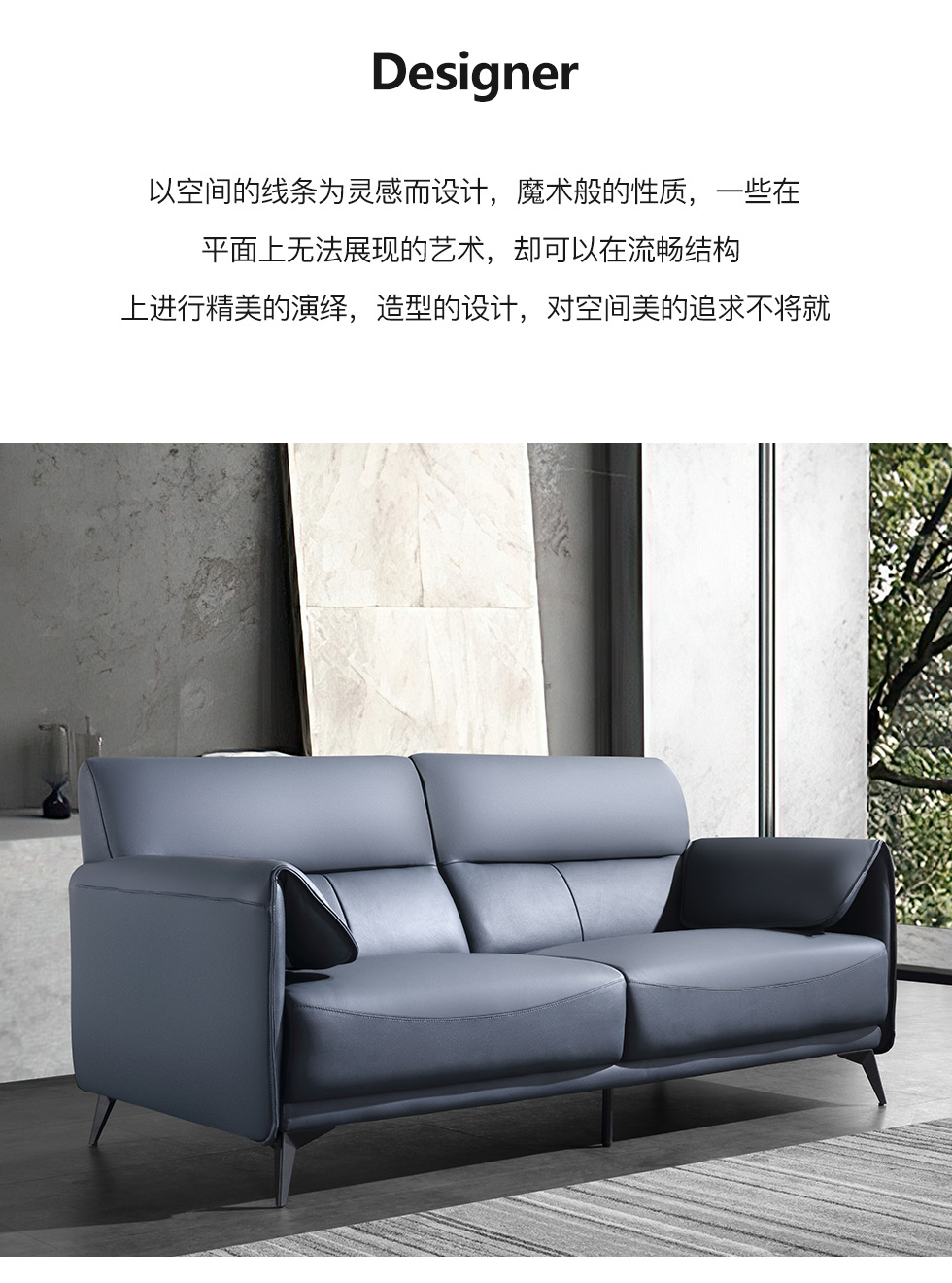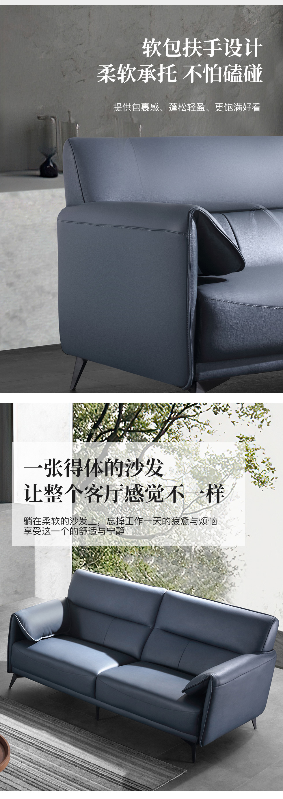 德卡图 现代简约 接触面进口头层牛皮+高密度海绵+俄罗斯进口落叶松框架 三人位 蓝色 皮艺2.65米沙发