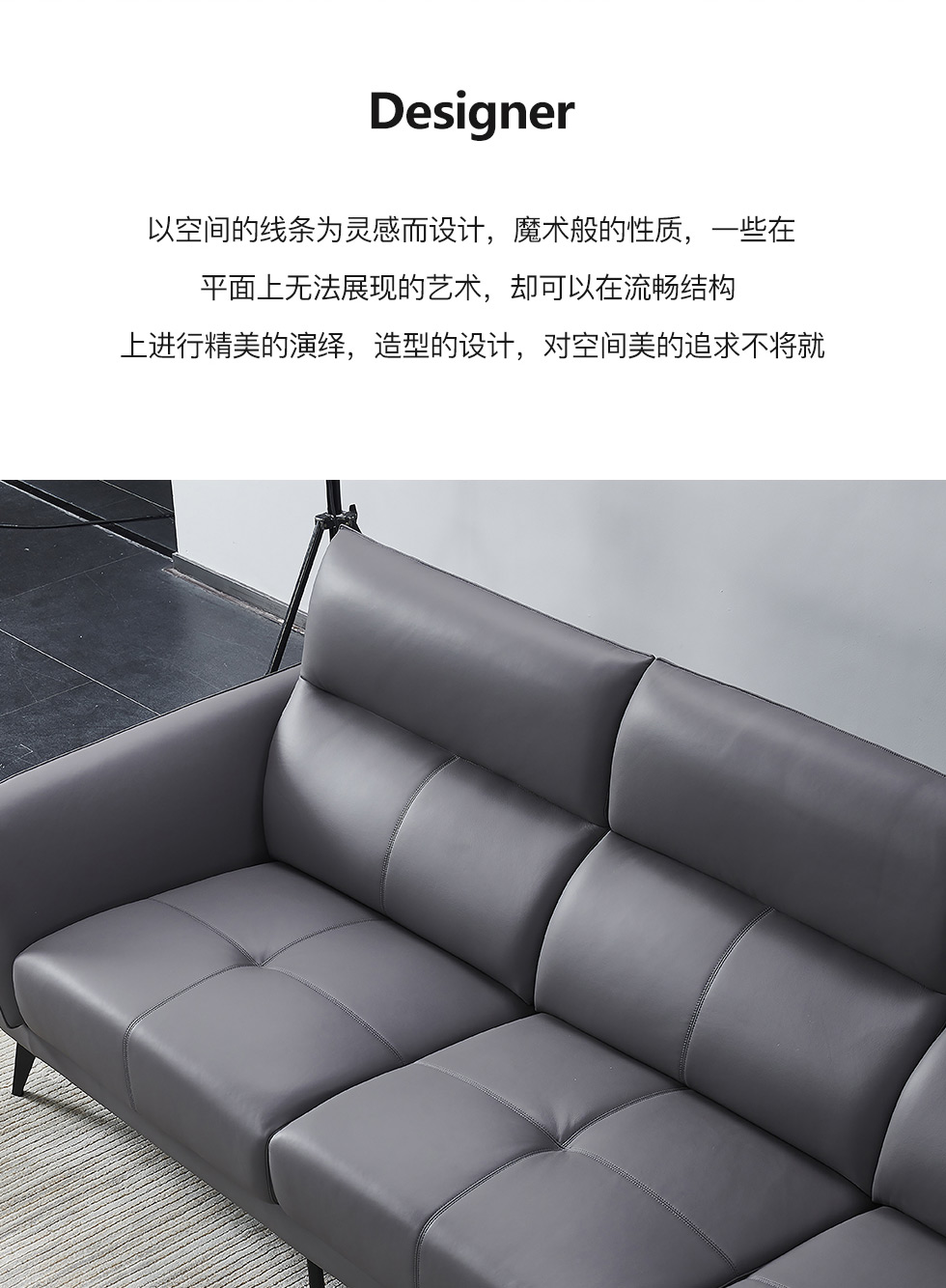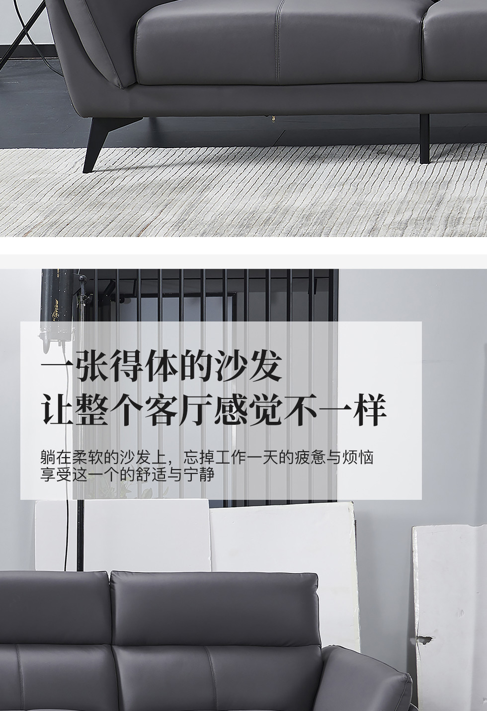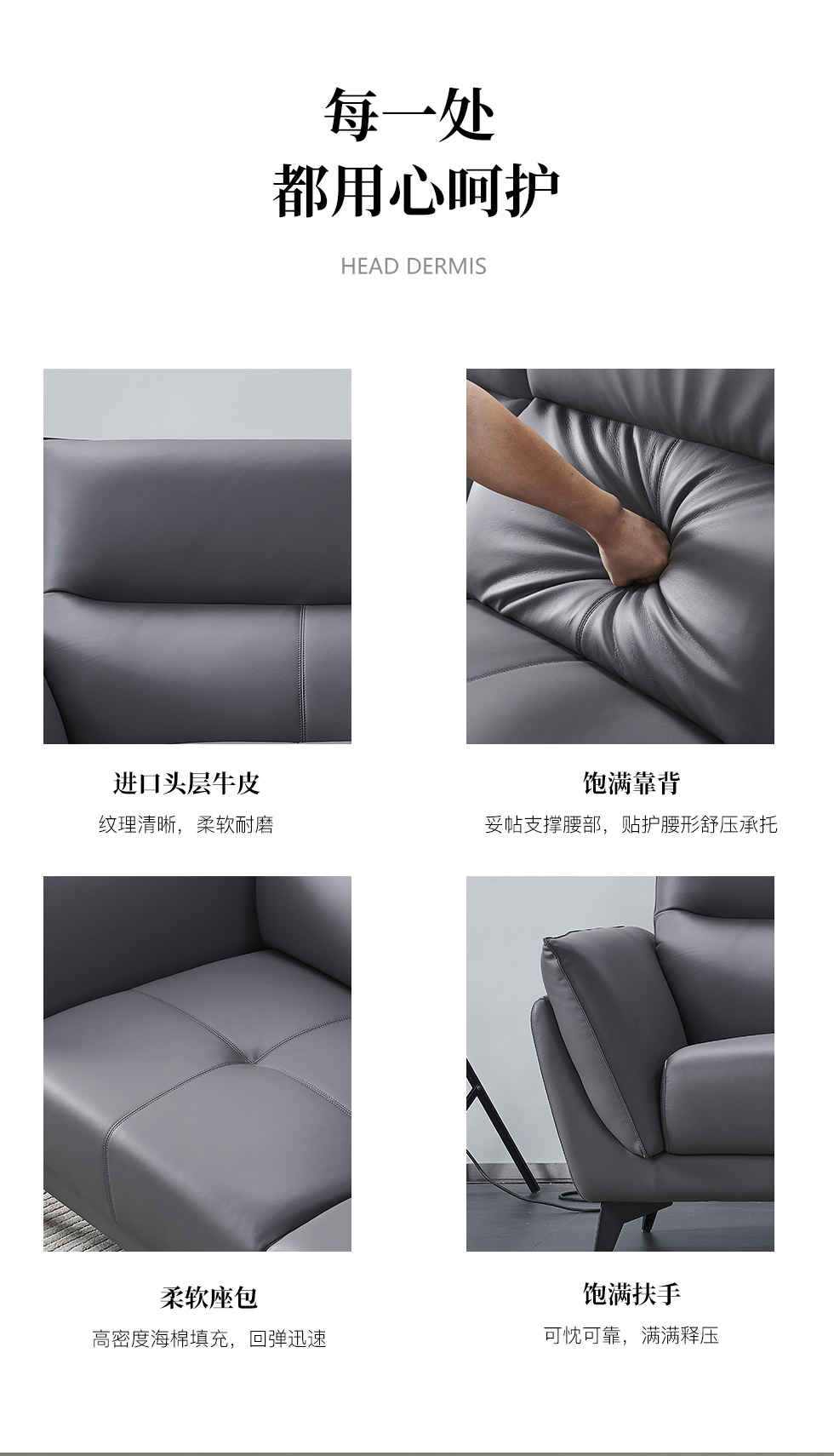 德卡图 现代简约 接触面进口头层牛皮+高密度海绵+俄罗斯进口落叶松框架+扶手羽绒+靠背公仔棉+可活动头枕 1+3+左贵妃位 深灰色 皮艺转角3.57米沙发¥10732