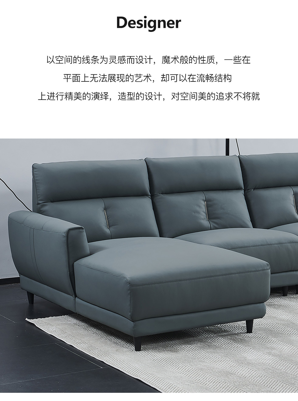 德卡图 现代简约 接触面进口头层牛皮+高密度海绵+俄罗斯进口落叶松框架 1+3+左贵妃位 浅蓝色 皮艺转角3.25米沙发