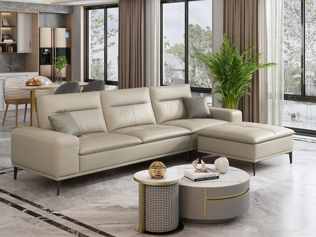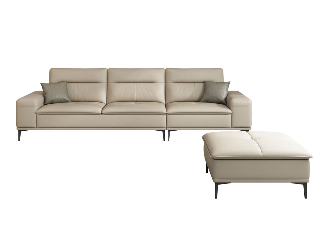 A系优选 现代简约 接触面超纤皮革+仿皮+抛光实木内架+合成板材框架+坐包填充高密度纯海绵+12分五金脚 卡其色 四位+脚踏 2.9米沙发 |