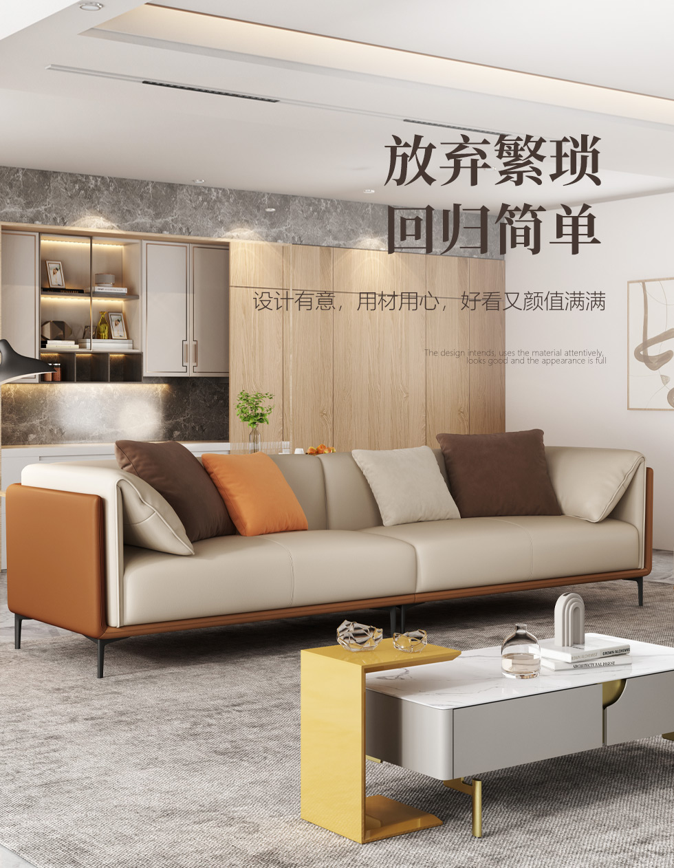 A系优选 现代简约 接触面优质仿真皮革+仿皮+靠包+抱枕婴儿绒布防水 抛光实木内架+合成板材框架+坐包填充高密度纯海绵+15公分五金脚 橙色+米黄 2.7米四人位+脚踏