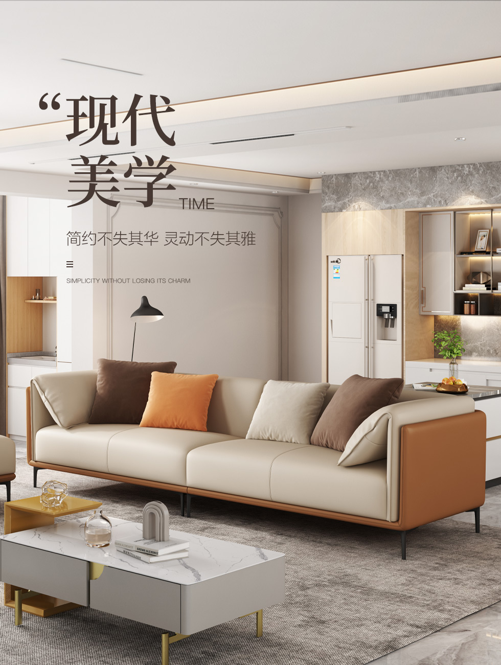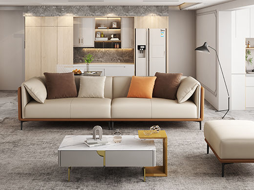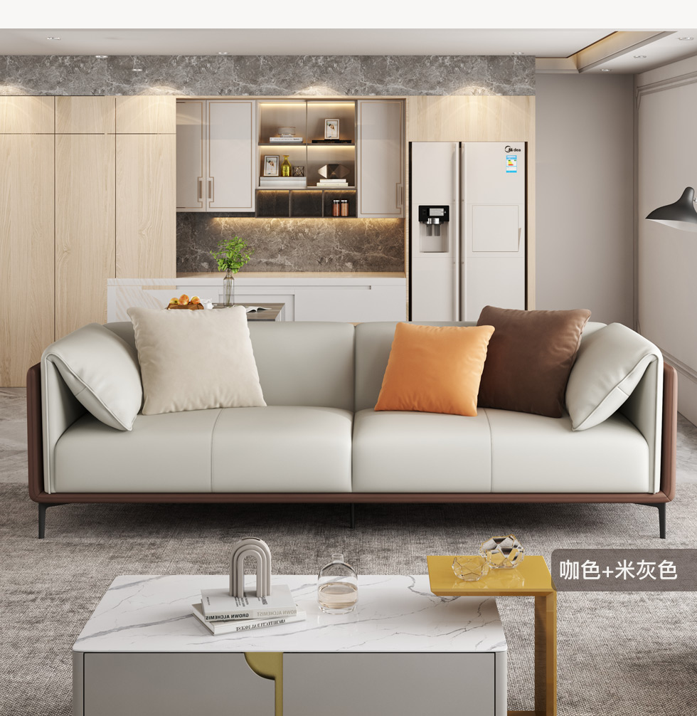 B系优选 现代简约 生态皮革,超纤皮+抛光实木内架(桉木为主)+合成板材框架+靠背腰包填充高密度海绵米色 直排(四位) 2.8米沙发¥6058