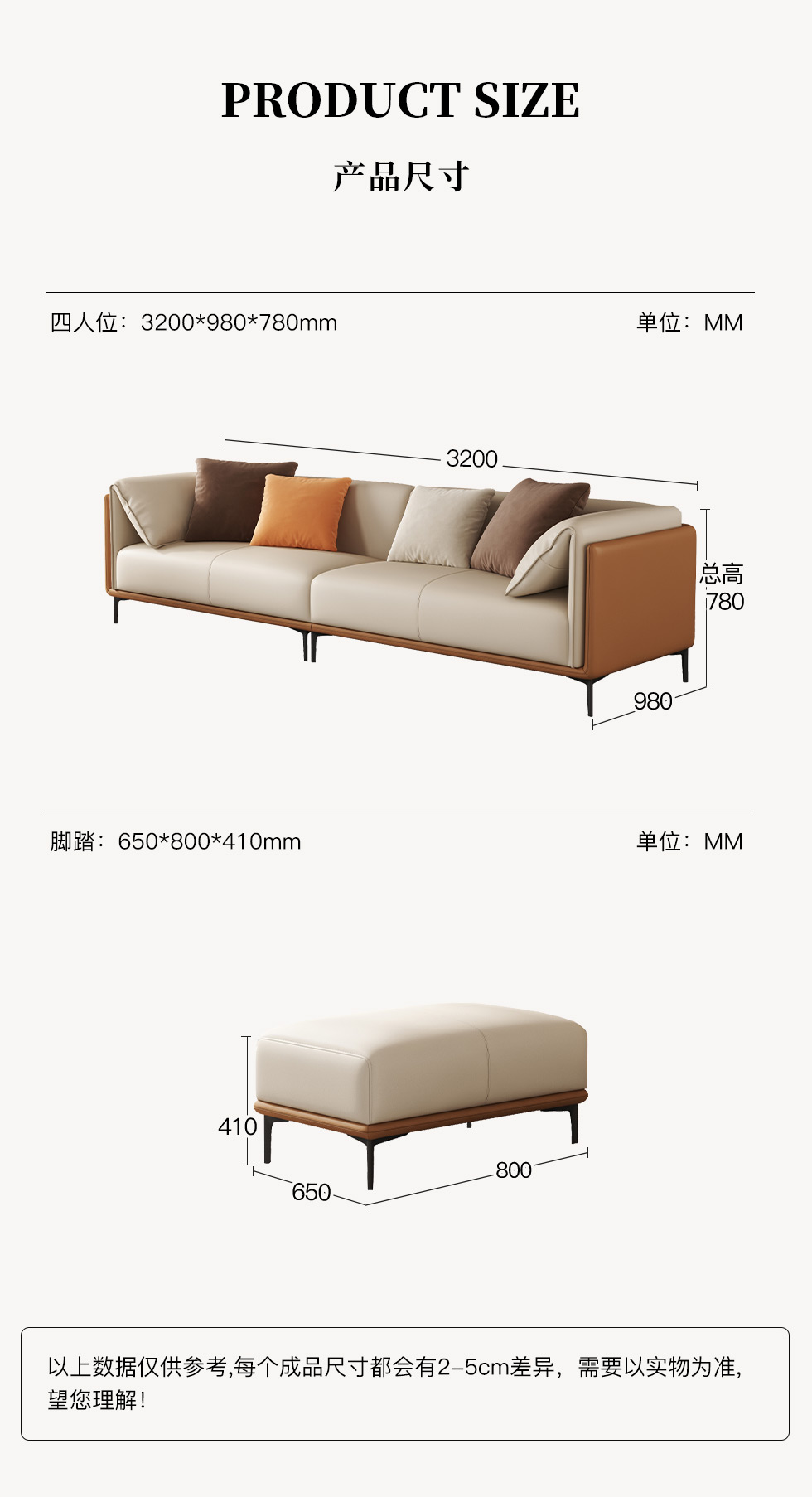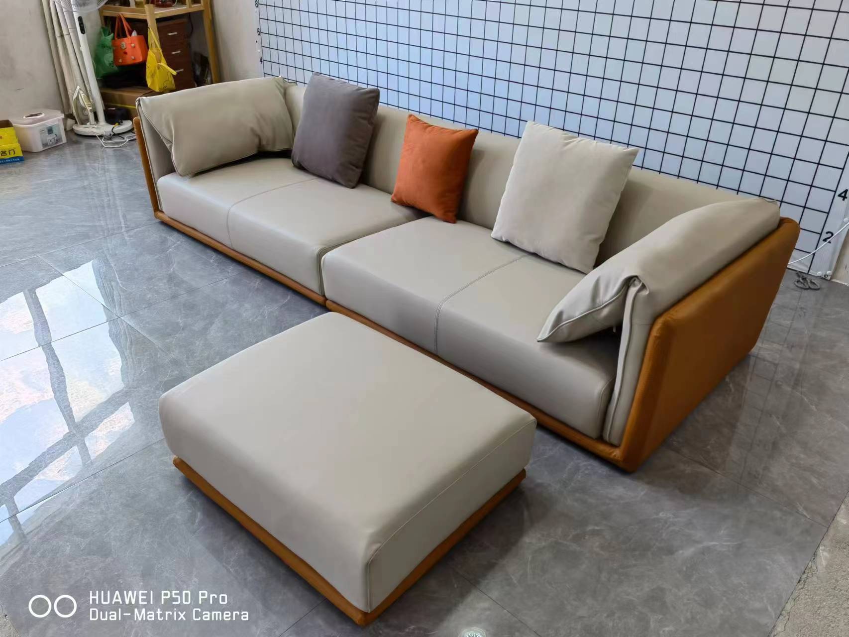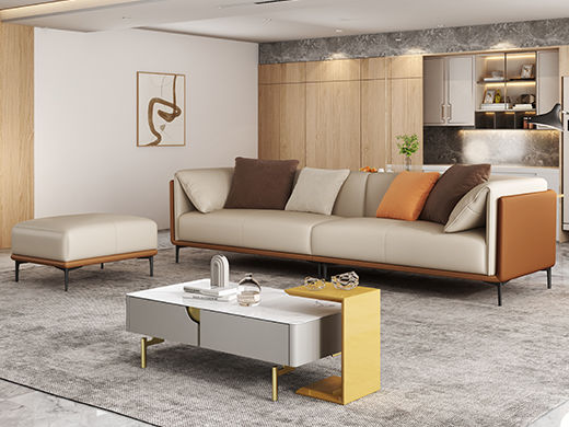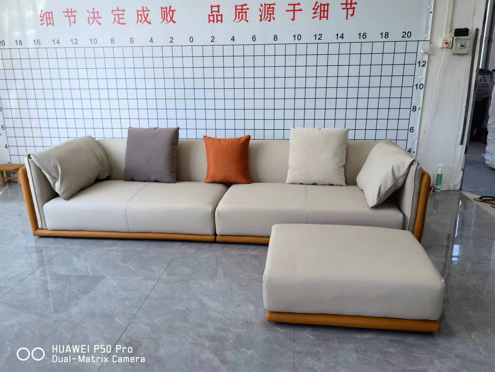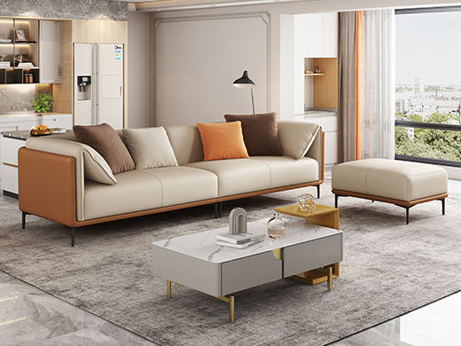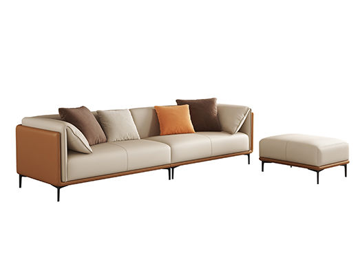 A系优选 现代简约 接触面优质仿真皮革+仿皮+靠包+抱枕婴儿绒布防水 抛光实木内架+合成板材框架+坐包填充高密度纯海绵+15公分五金脚 橙色+米黄 2.7米四人位+脚踏 |