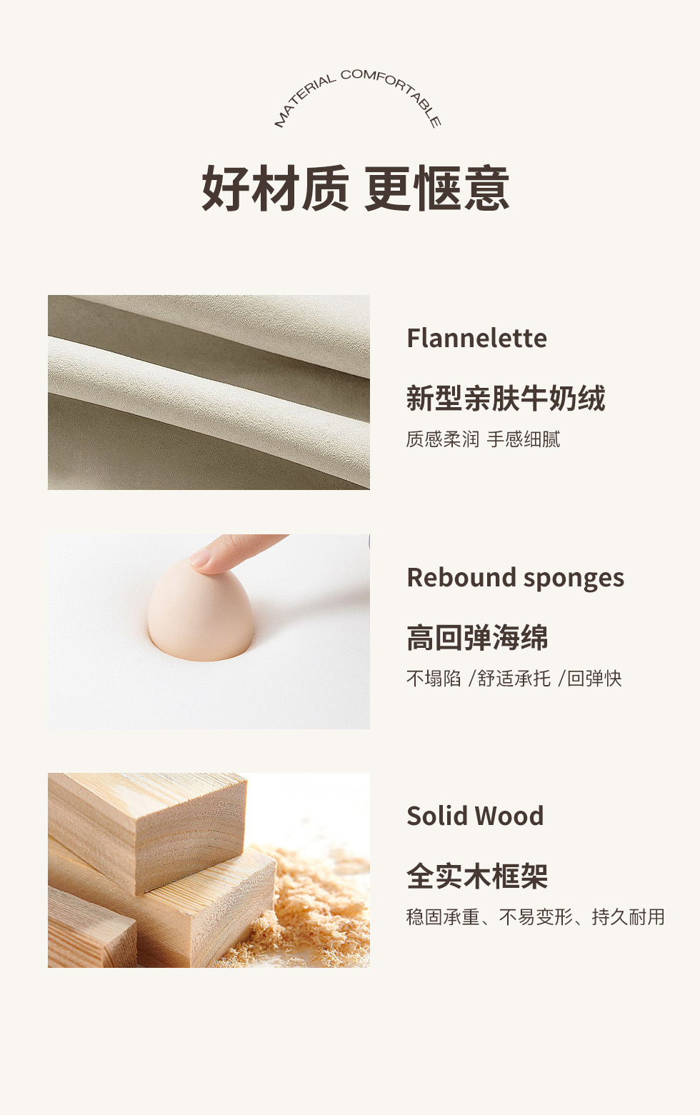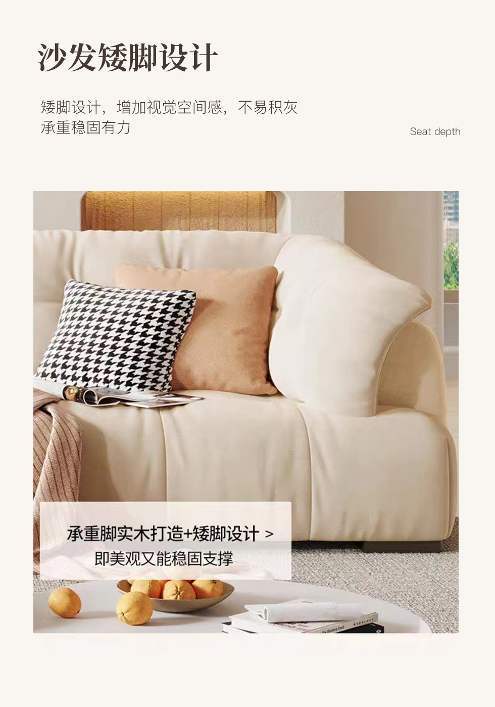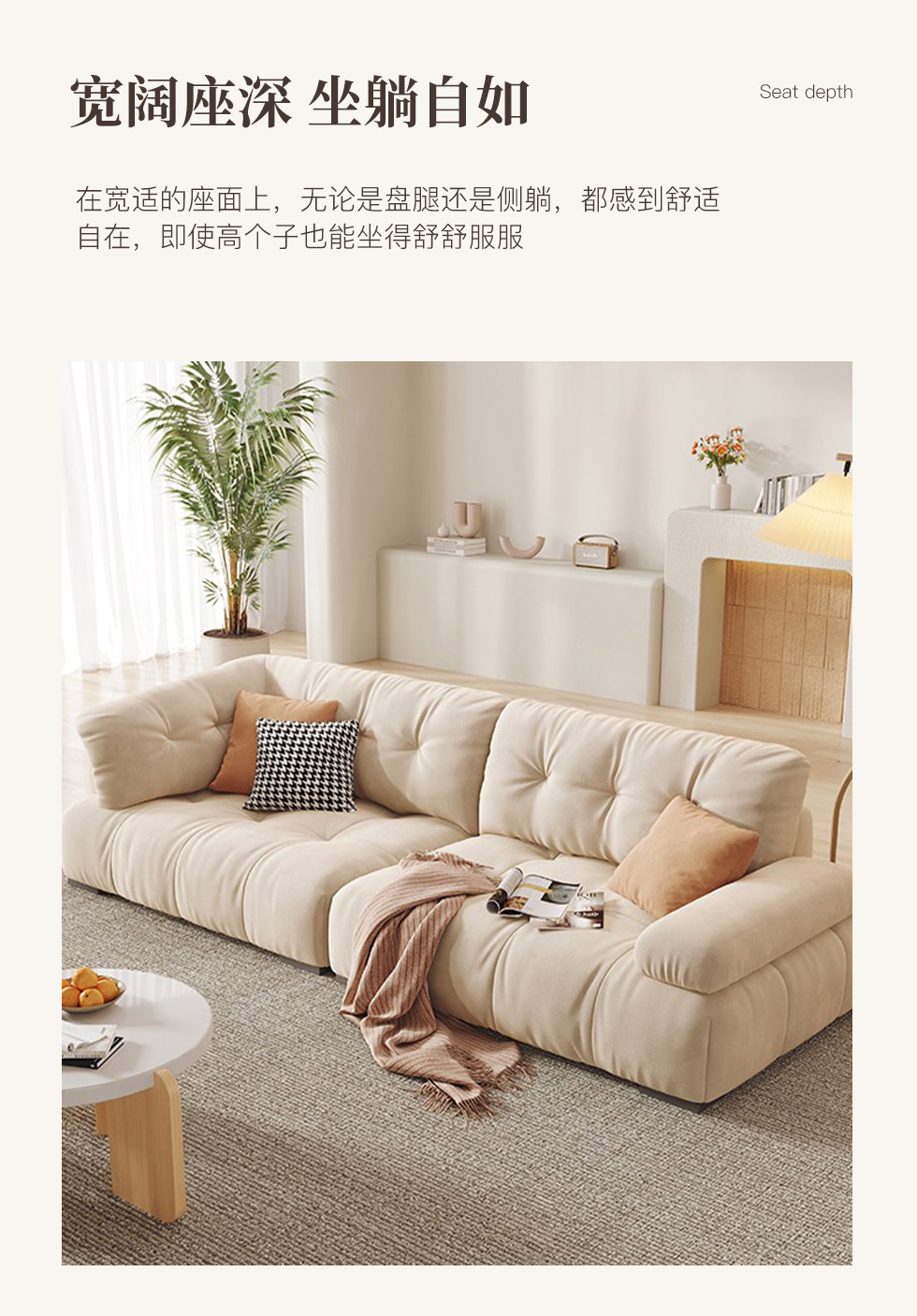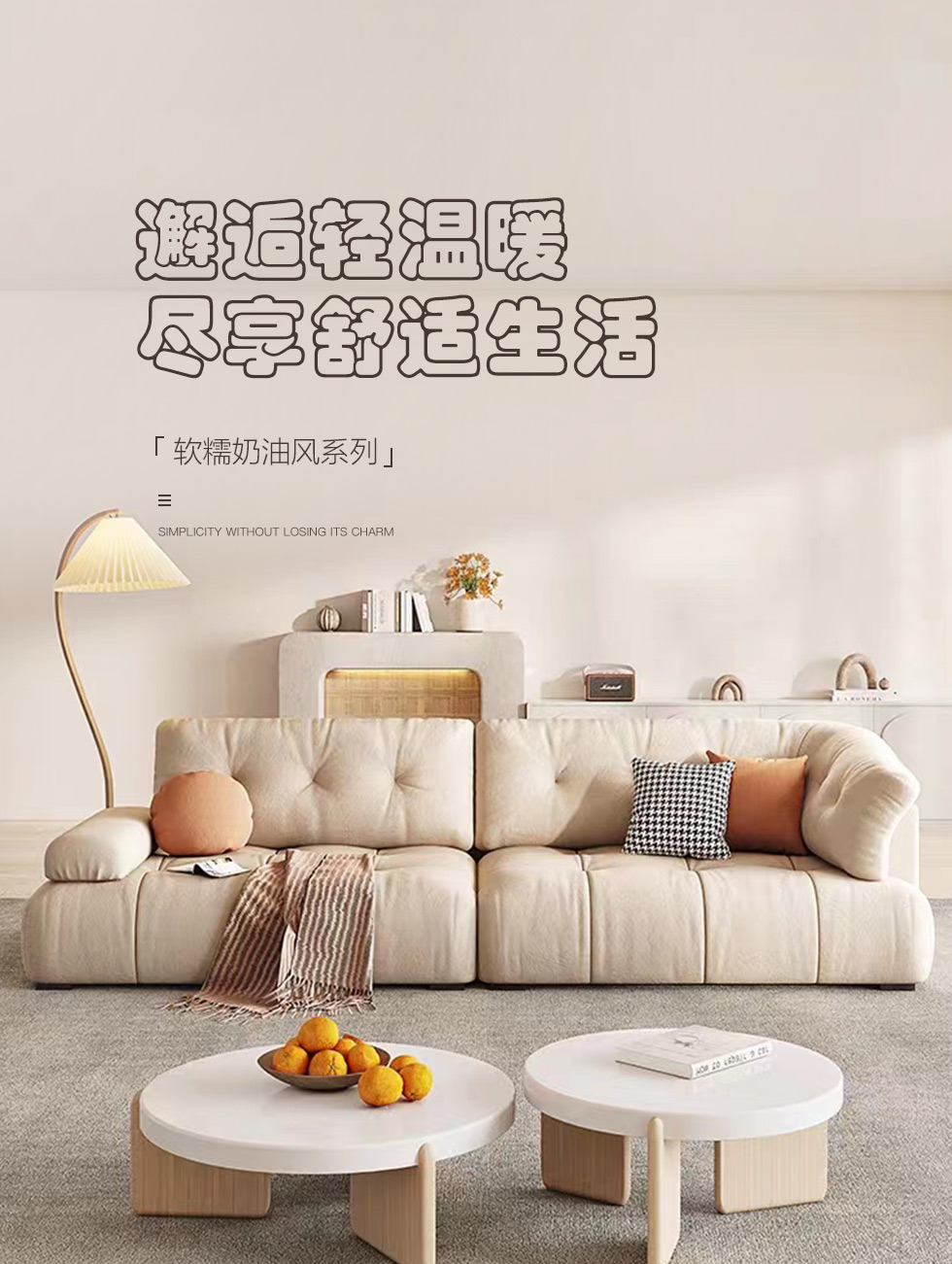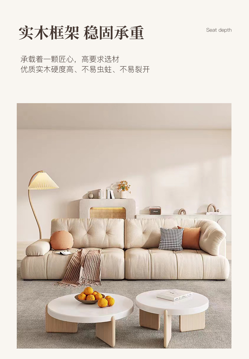 云端 奶油风 羊羔绒布料+抛光实木内架+合成板材框架+坐包填充高密度纯海绵+5公分实木圆脚 米白色 2.7米四人位+圆凳¥8155