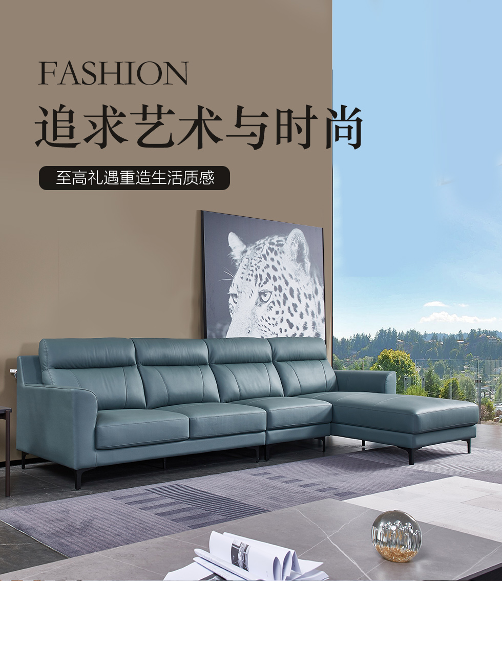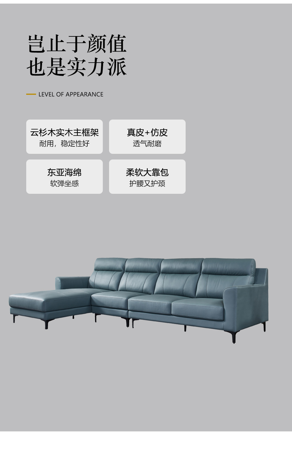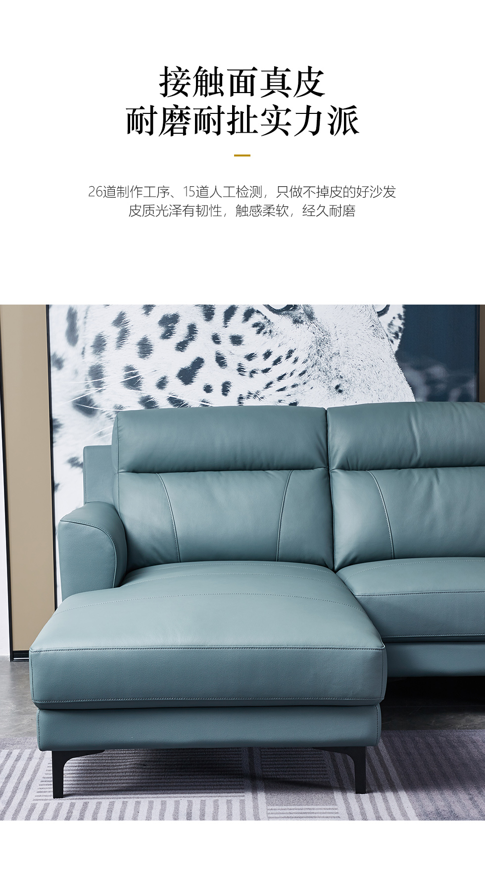 CBD家居 极简 接触面真皮+非接触面仿皮+东亚海绵+云杉木实木主框架 TE07天青色 1+3+右手贵妃 转角3.156米沙发