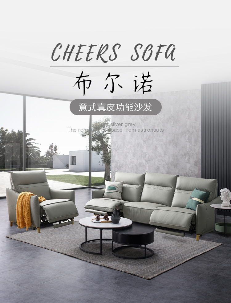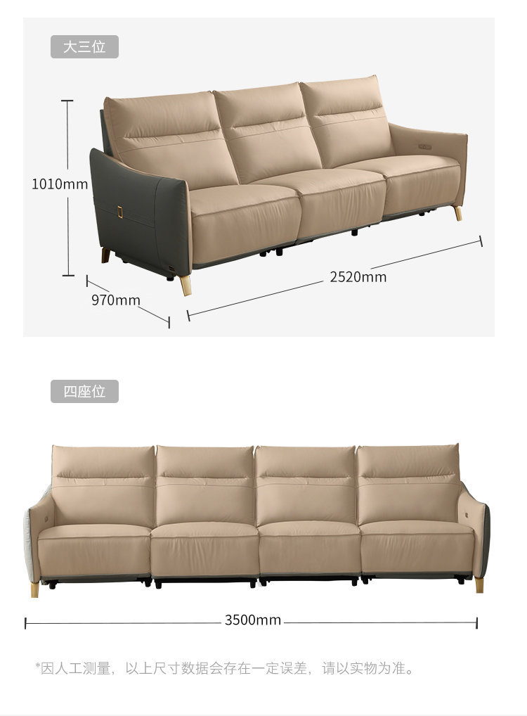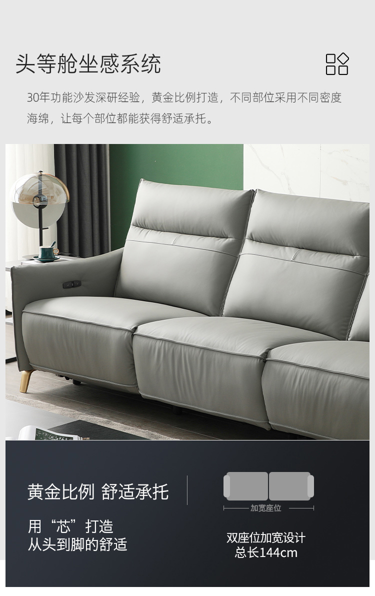 甄品家具 现代简约 接触面进口头层牛皮+进口 落叶松+高 回弹海绵+高承重碳 钢功能架+零靠墙锐迈电机+单电动功能 碳素钢脚 3米 三人位 单电动功能沙发