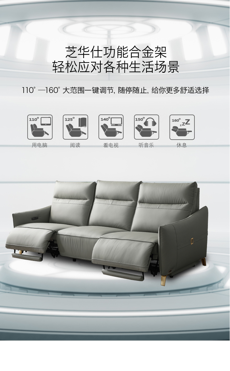 芝华仕 现代简约 接触面进口头层奶牛皮+PVC+合金钢架+进口实木+多层实木板+合金刚架脚+塑胶防刮胶套+太空绵+高回弹海绵 三人位【双电机】功能皮艺2.6米沙发