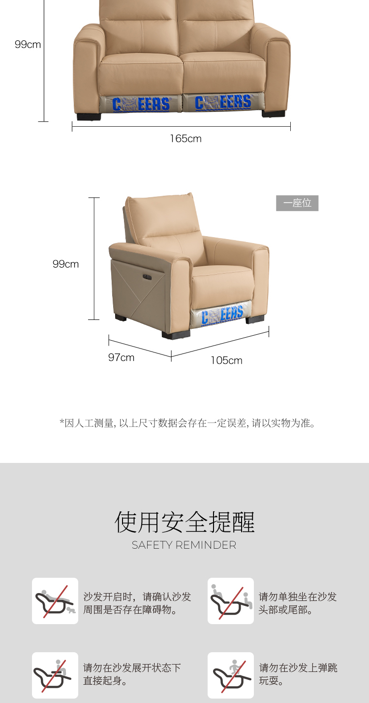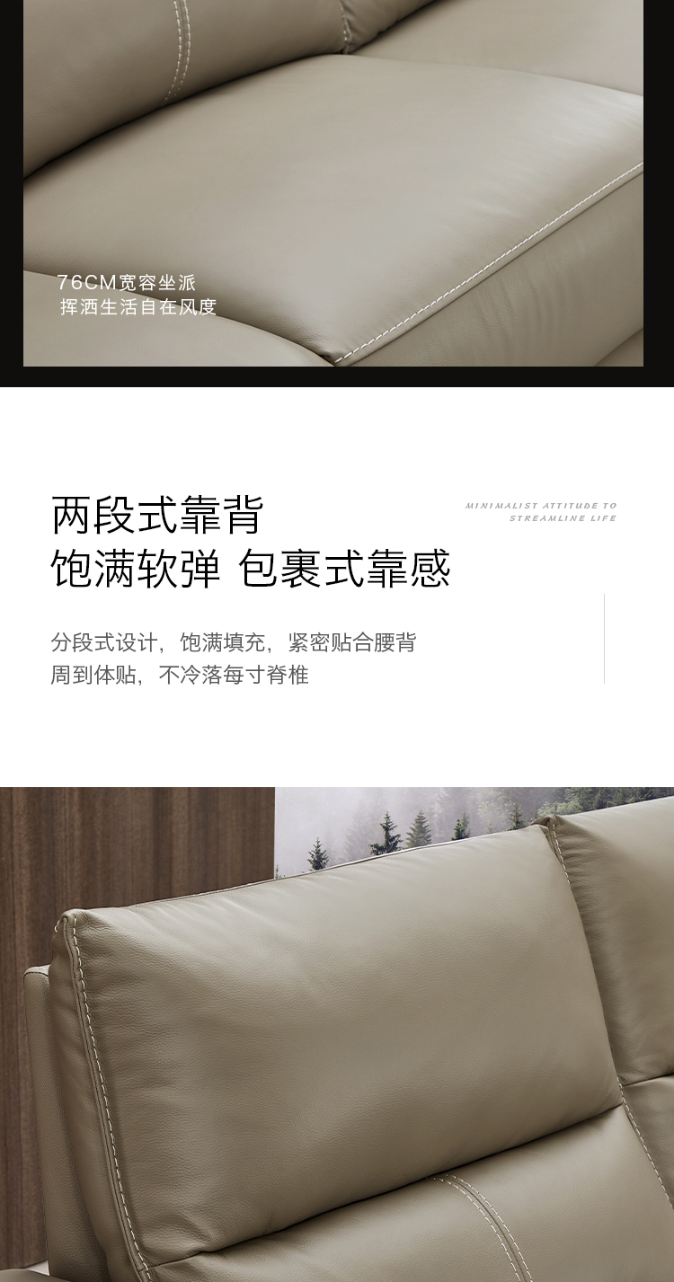甄品家具 现代简约 接触面进口头层牛皮+进口 落叶松+高 回弹海绵+高承重碳 钢功能架+零靠墙锐迈电机+单电动功能 碳素钢脚 3米 三人位 单电动功能沙发