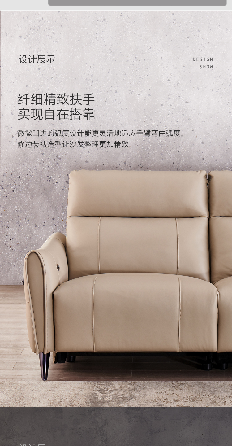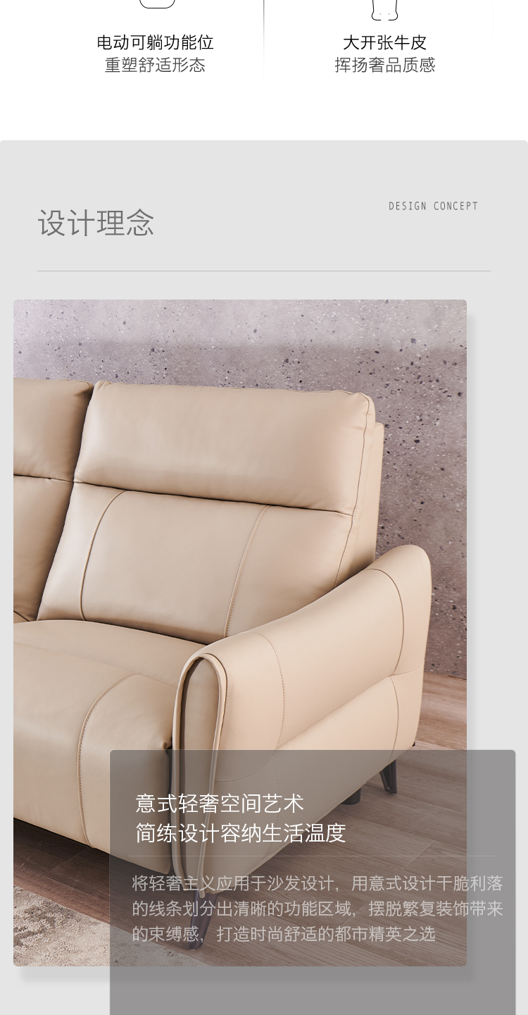 甄品家具 现代简约 接触面进口头层牛皮+进口 落叶松+高 回弹海绵+高承重碳 钢功能架+零靠墙锐迈电机+单电动功能 碳素钢脚 3米 三人位 单电动功能沙发