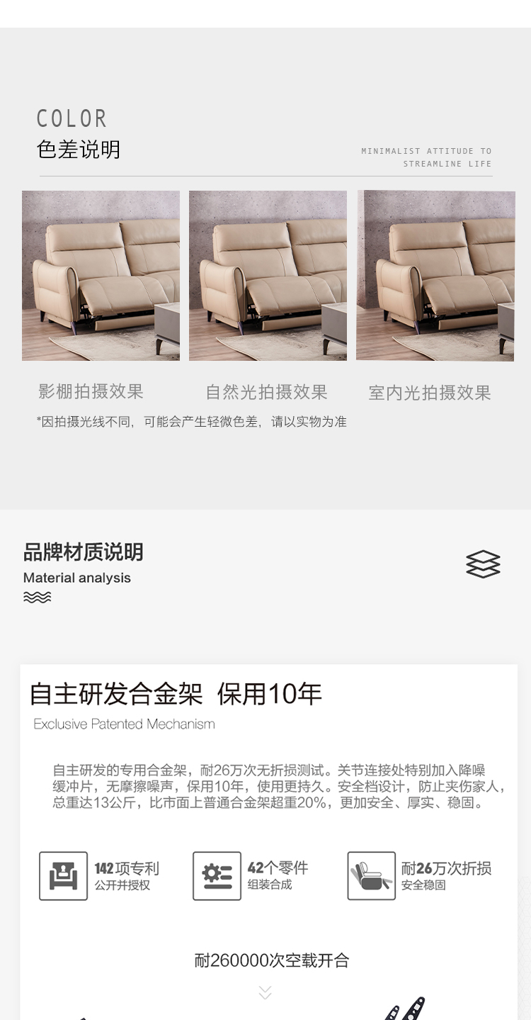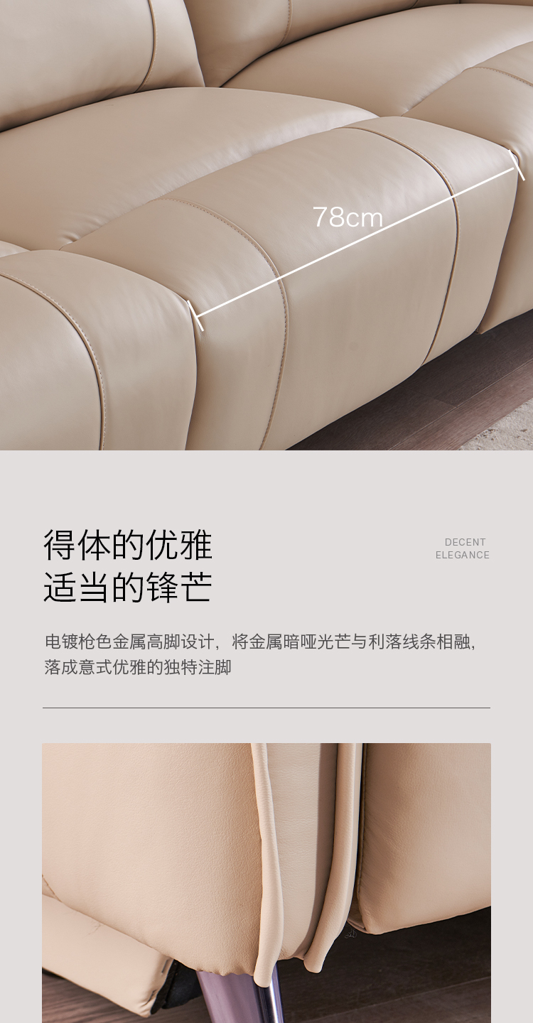 甄品家具 现代简约 接触面进口头层牛皮+进口 落叶松+高 回弹海绵+高承重碳 钢功能架+零靠墙锐迈电机+单电动功能 碳素钢脚 3米 三人位 单电动功能沙发