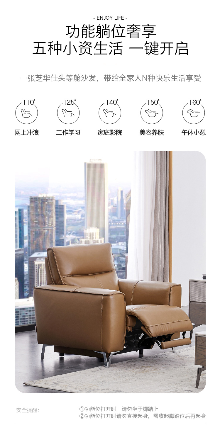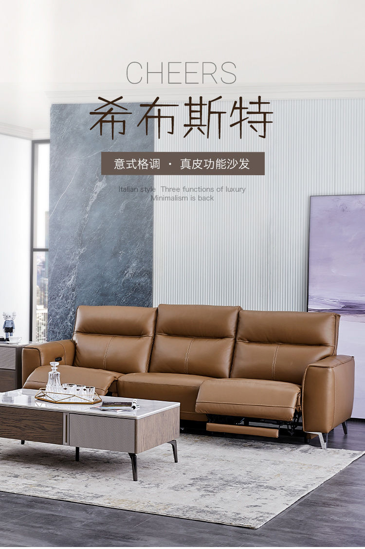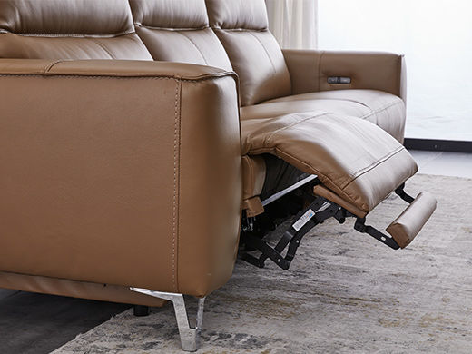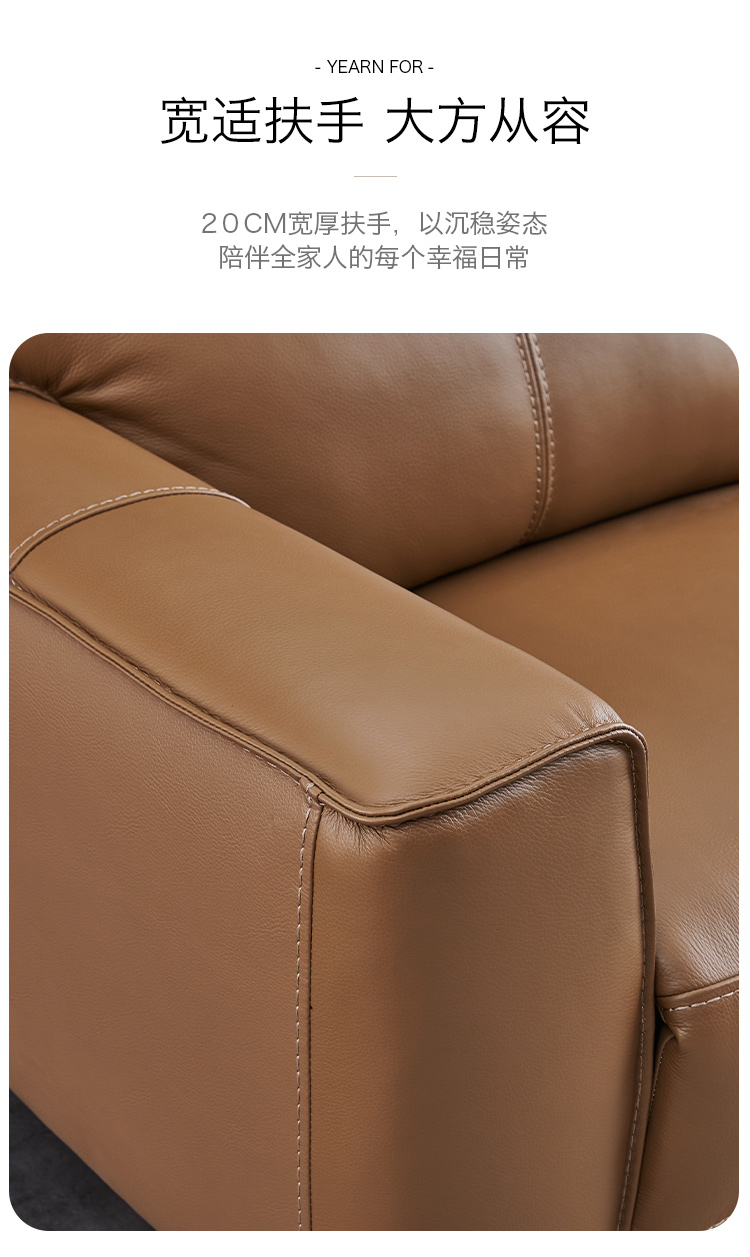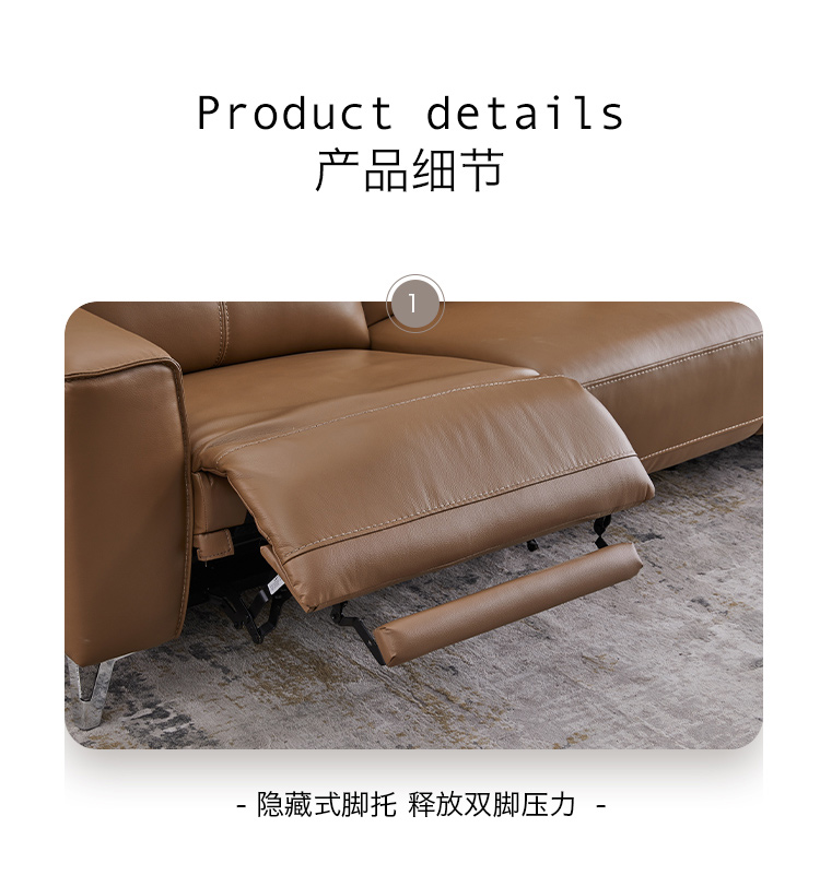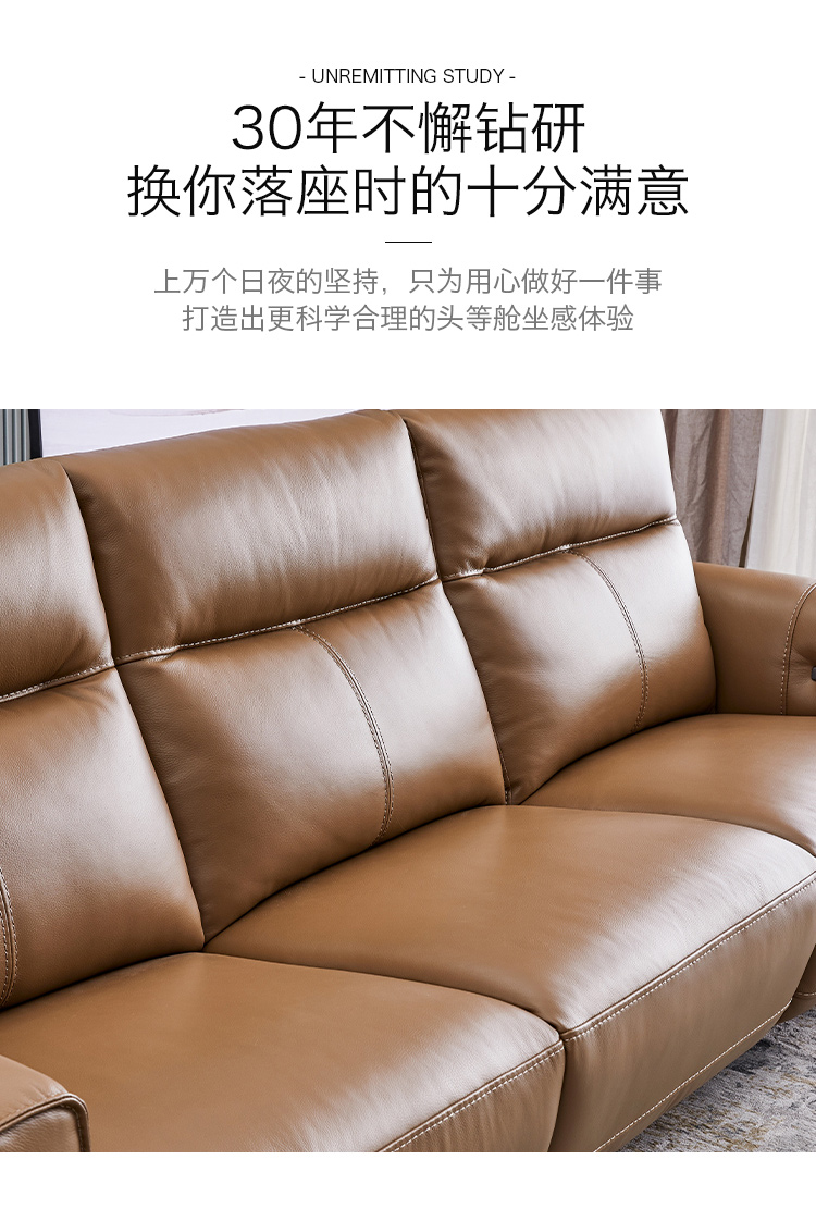 甄品家具 现代简约 接触面进口头层牛皮+进口 落叶松+高 回弹海绵+高承重碳 钢功能架+零靠墙锐迈电机+单电动功能 碳素钢脚 3米 三人位 单电动功能沙发