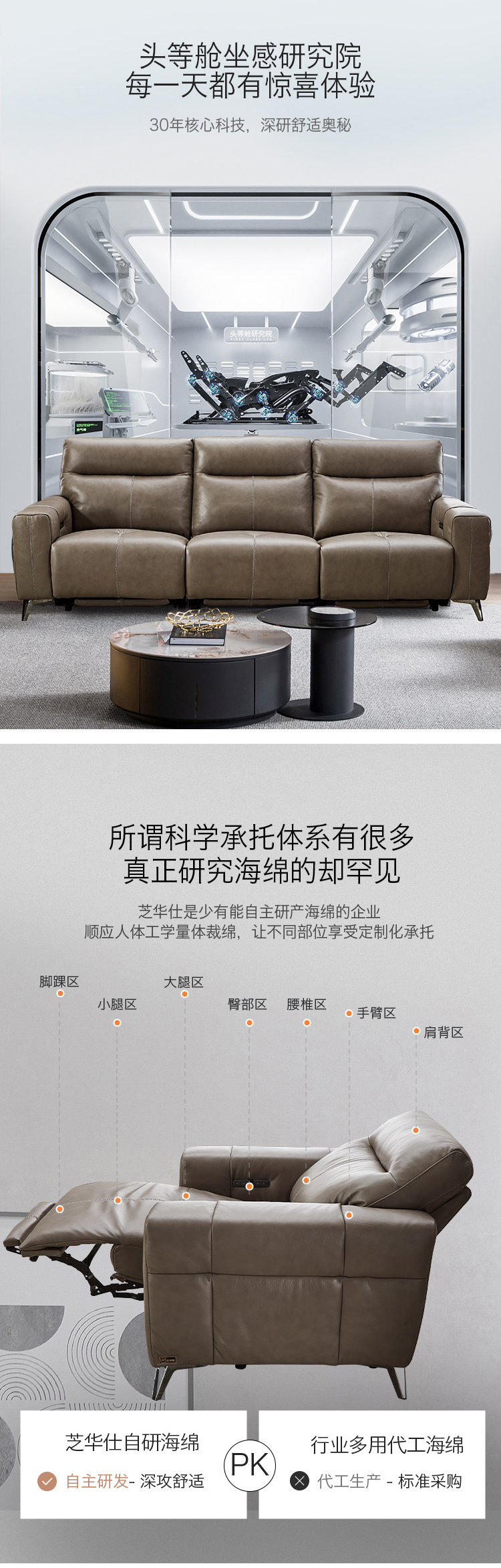 芝华仕 现代简约 接触面进口头层奶牛皮+科技布+合金钢架+进口实木+多层实木板+合金脚+太空绵+高回弹海绵 三人位【双电机】皮艺2.52米沙发