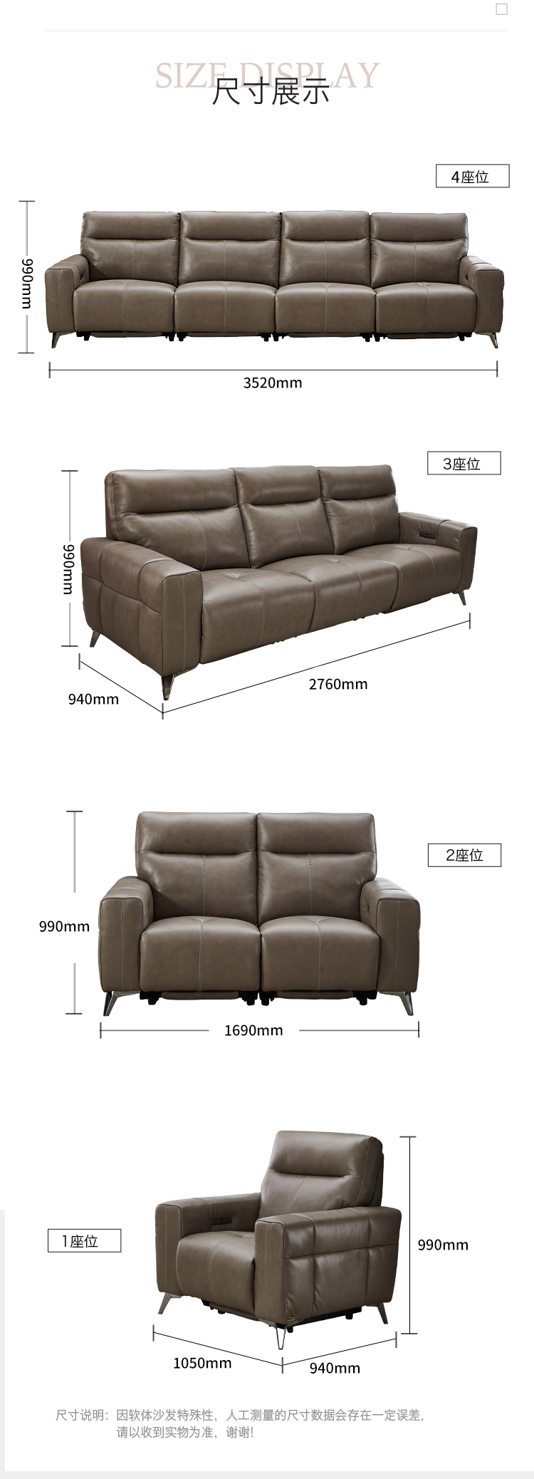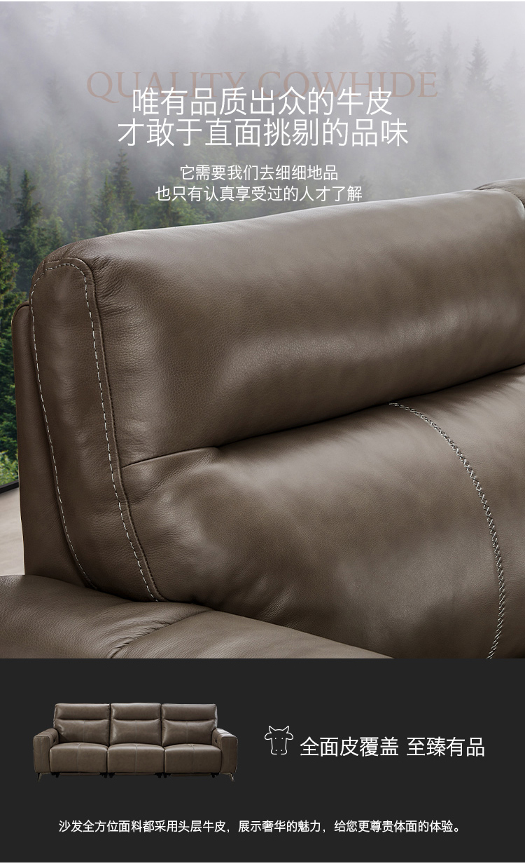 甄品家具 现代简约 接触面进口头层牛皮+进口 落叶松+高 回弹海绵+高承重碳 钢功能架+零靠墙锐迈电机+单电动功能 碳素钢脚 3米 三人位 单电动功能沙发