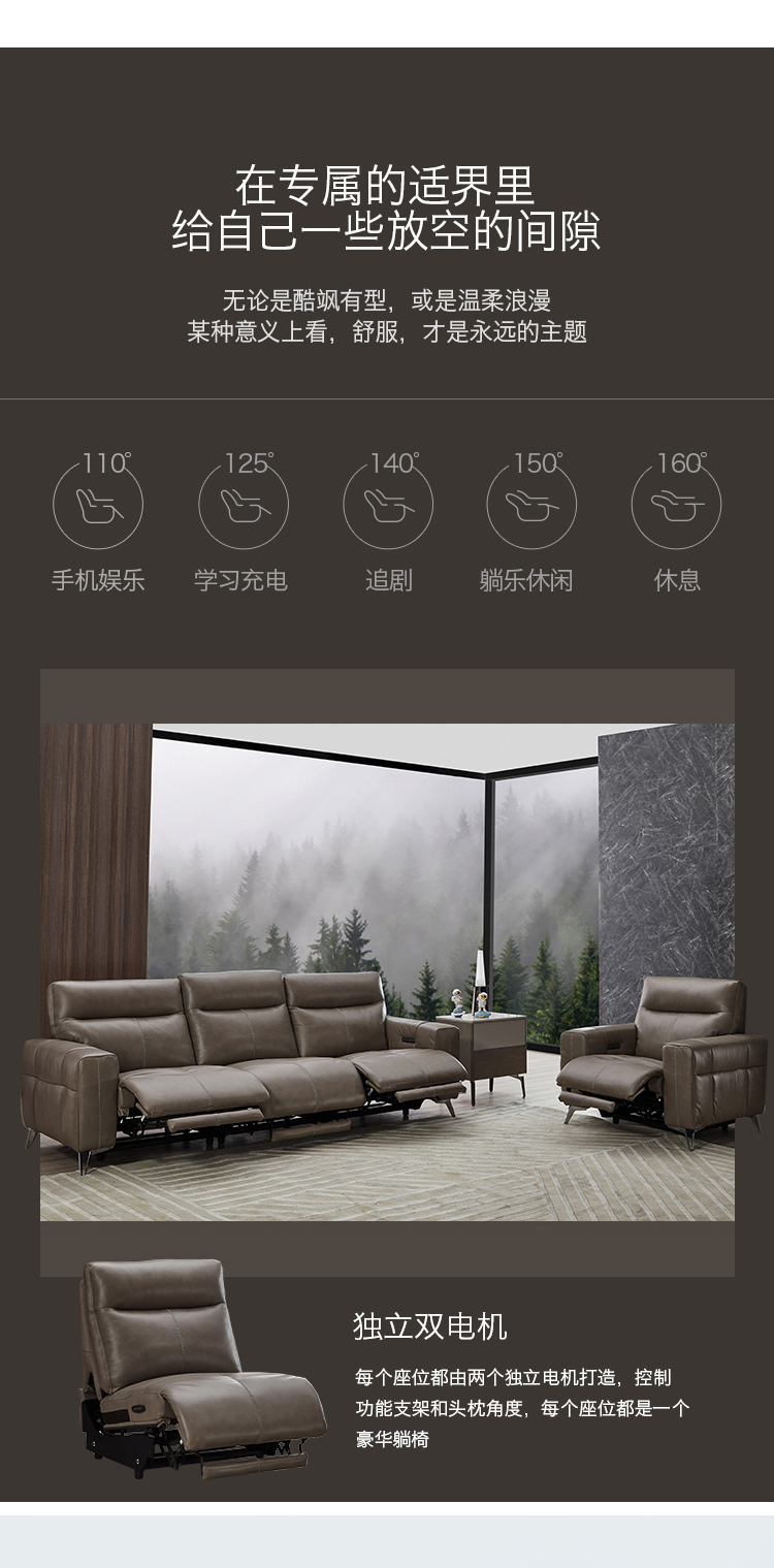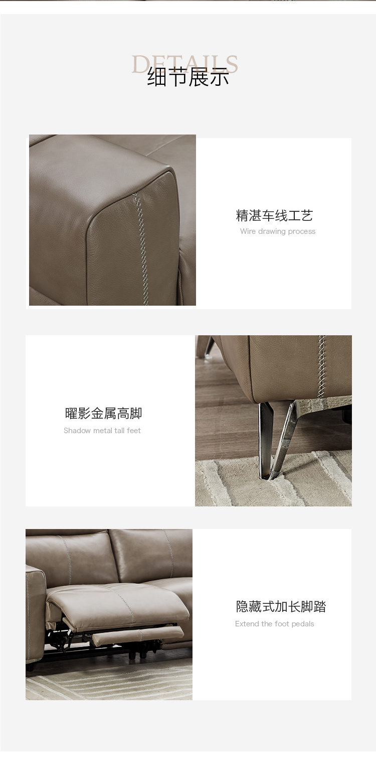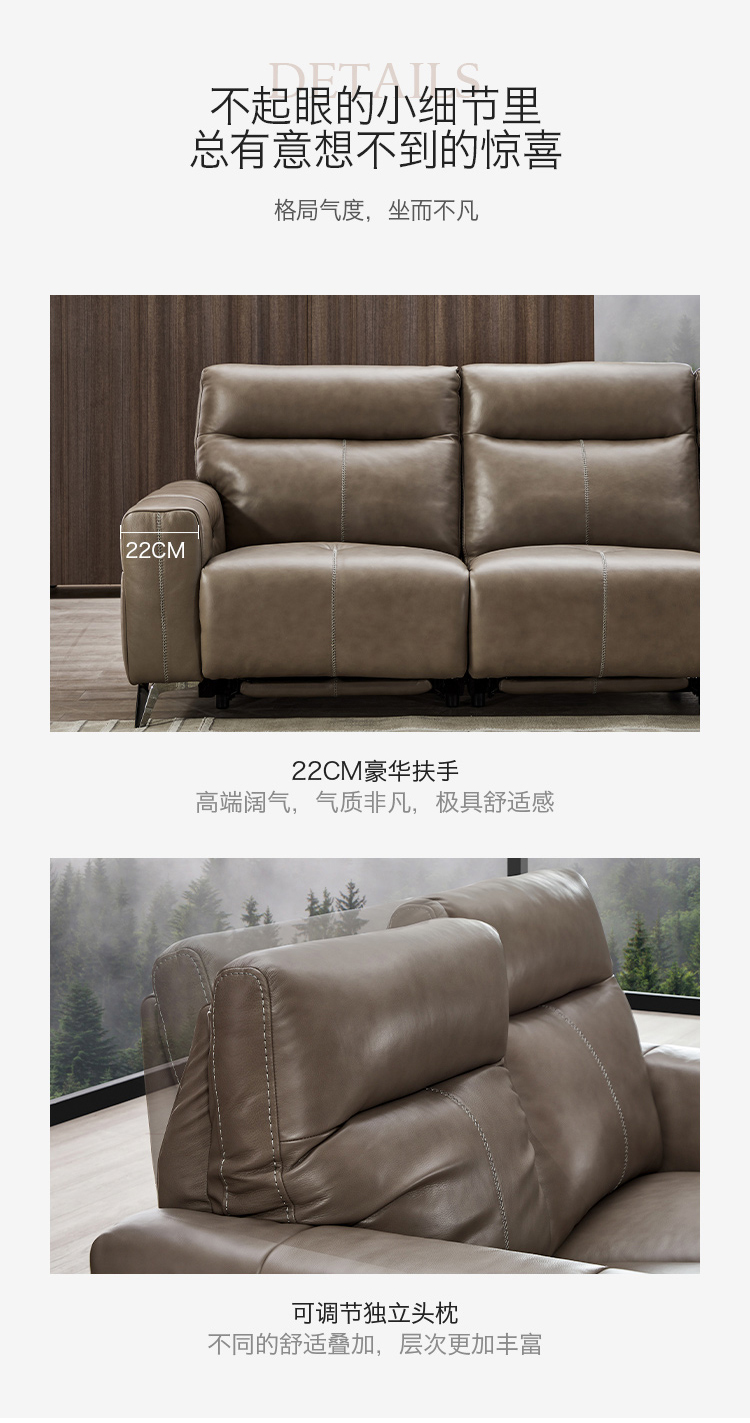甄品家具 现代简约 接触面进口头层牛皮+进口 落叶松+高 回弹海绵+高承重碳 钢功能架+零靠墙锐迈电机+单电动功能 碳素钢脚 3米 三人位 单电动功能沙发