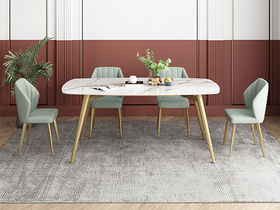 B系优选 轻奢 碳素钢喷金+12MM马肚形岩板 餐桌: (亮光雪山白)卡塔金。 餐椅:浅绿色 1.4米餐桌+4把餐椅(含底板)