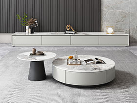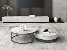 非凡工艺 现代简约 中纤板 亮光烤漆+碳素钢脚架+岩板6mm+8mm茶色钢化玻 卡塔金+奶油色烤漆 组合圆茶几+2米电视柜