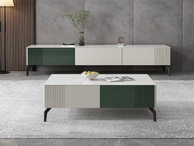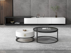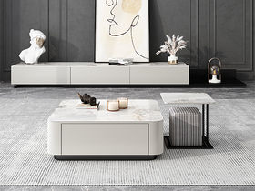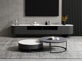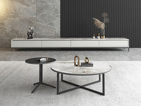 非凡工艺 现代简约 中纤板 亮光烤漆+碳素钢脚架+岩板6mm+8mm茶色钢化玻 卡塔金+奶油色烤漆 组合圆茶几+2米电视柜
